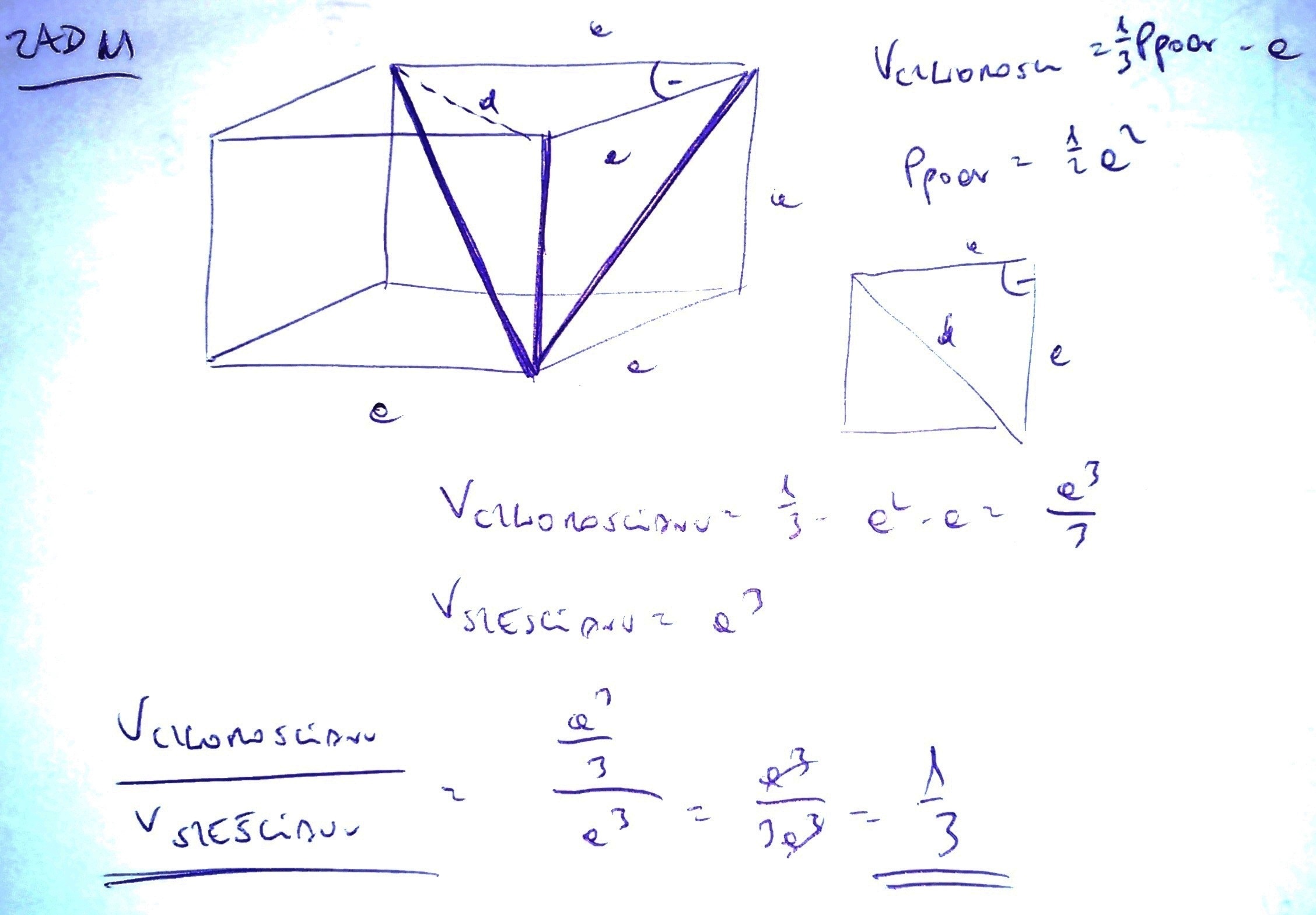 zad11 W sześcianie krawędź boczna, przekątna sześcianu i przekątna ściany bocznej, wychodzące z jednego wierzchołka, są krawędziami bocznymi czworościanu, którego podstawą jest trójkąt prostokątny. Oblicz stosunek objętości czworościanu do objętości sześcianu.