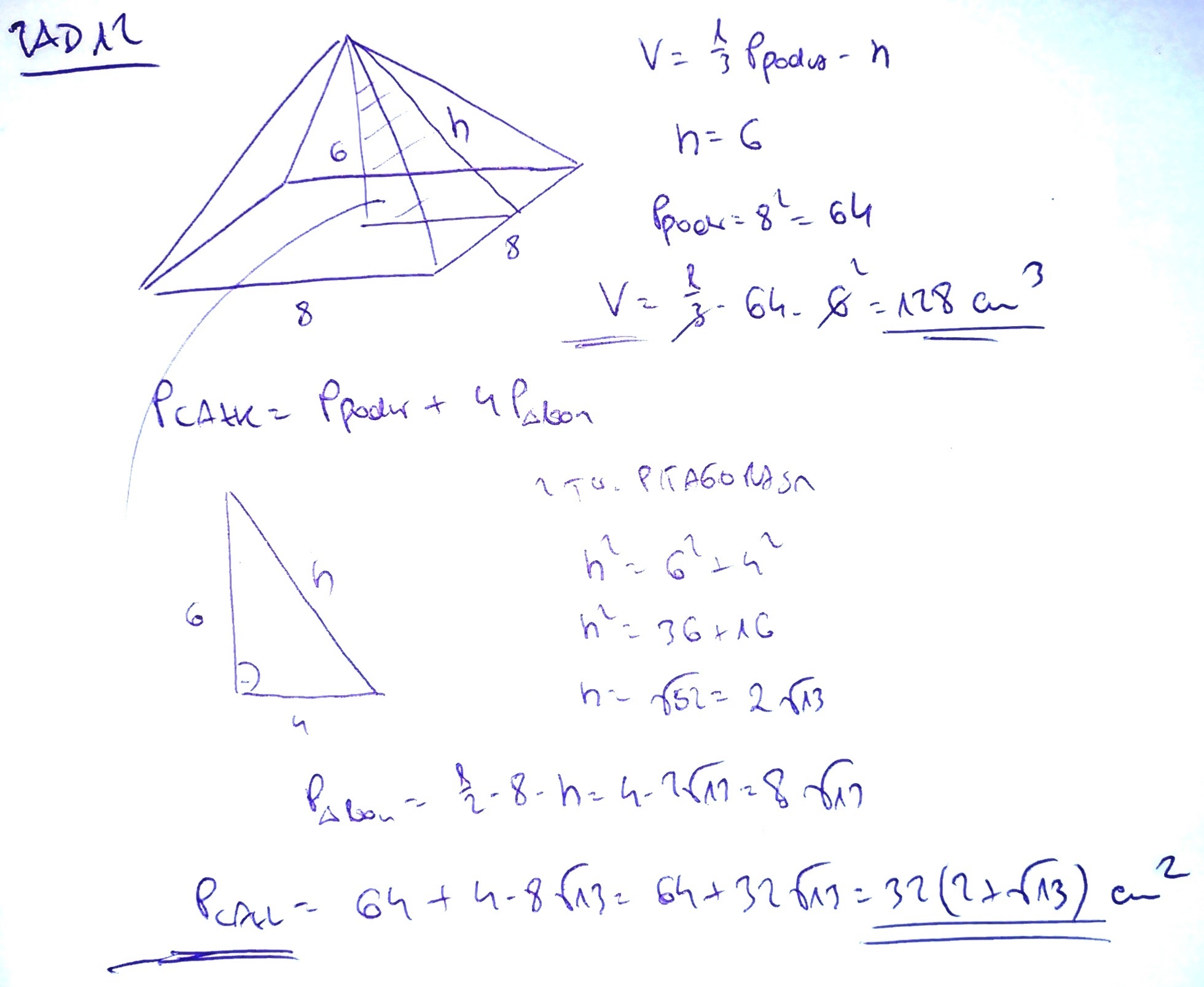 zad12 Oblicz pole powierzchni całkowitej ostrosłupa prawidłowego czworokątnego, jeżeli krawędź podstawy ma długość 8cm, a wysokość ostrosłupa jest równa 6cm.