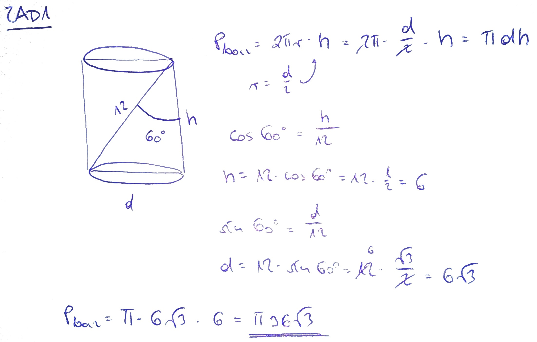 1. przekątna przekroju osiowego walca ma długość 12 i tworzy z wysokością walca kąt 60 pole powierzchni bocznej walcajest rowna