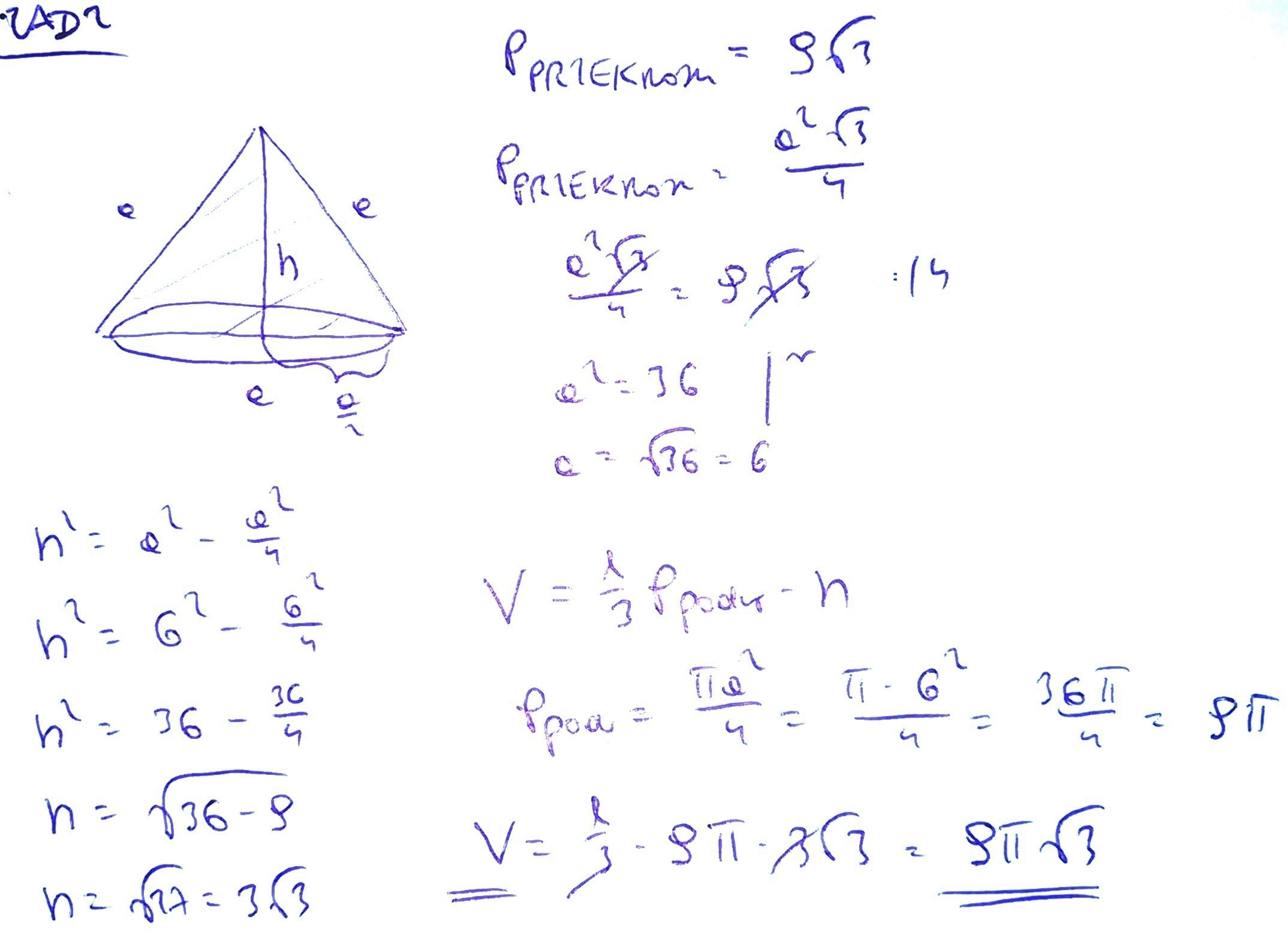 2. przekroj osiowy stozka jest trojkatem rownobocznym o polu 9 pierwiastkow 3 obj tego stozka wynosi