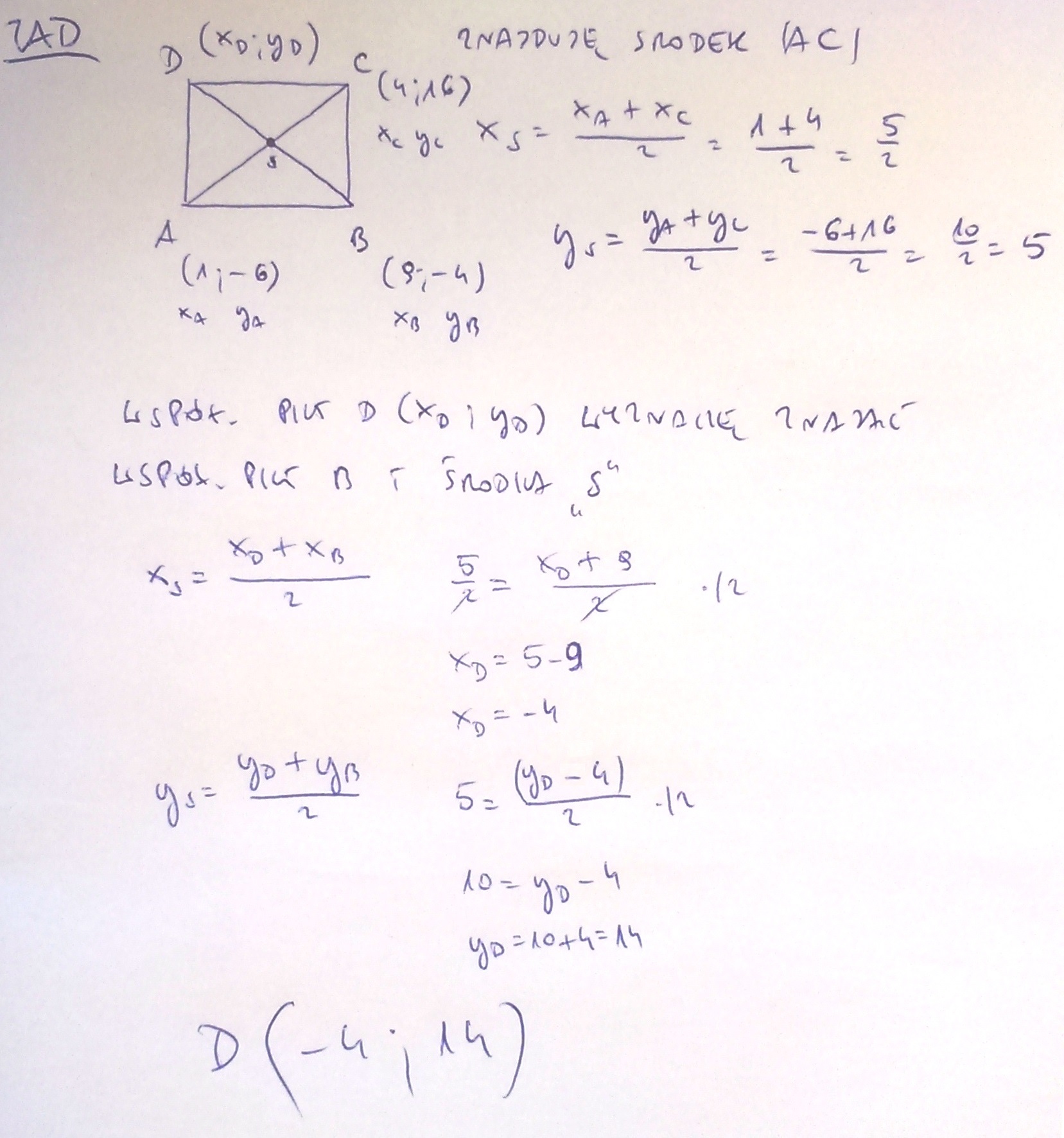 Punkty A(1; -6), B(9; -4), C(4; 16) są kolejnymi wierzchołkami prostokąta ABCD. Oblicz współrzędne wierzchołka D.