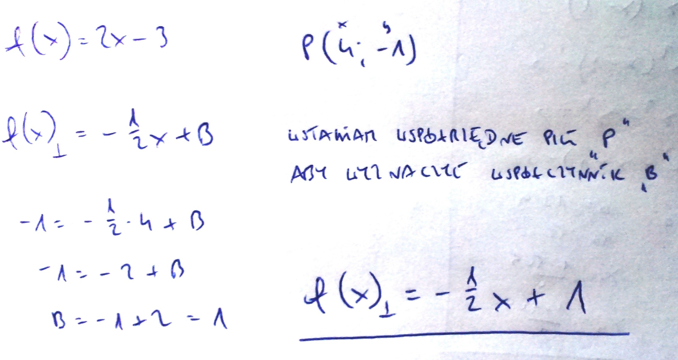 Napisz wzór funkcji liniowej, której wykres jest prostopadły do wykresu funkcji f(x)=2x-3 i przechodzi przez P(4, -1).