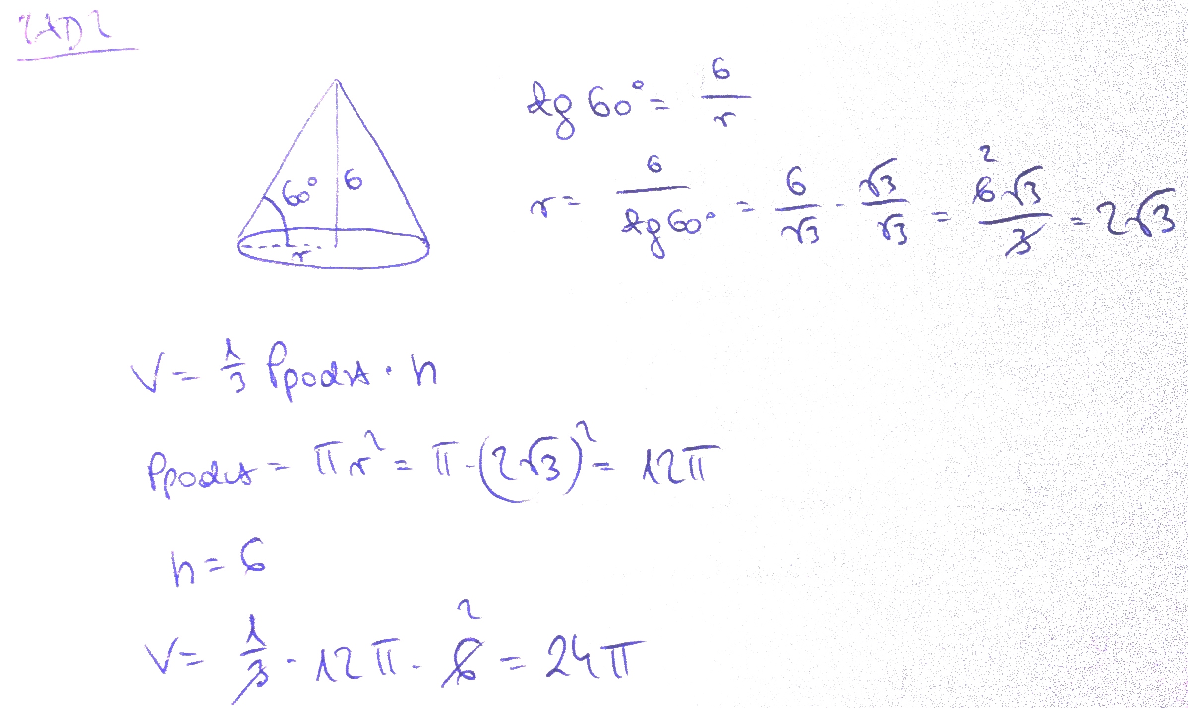 2. Tworząca stożka jest nachylona do płaszczyzny podstawy pod kątem 60 stopni. Wysokość stożka ma długość 6. Oblicz jego objętość.