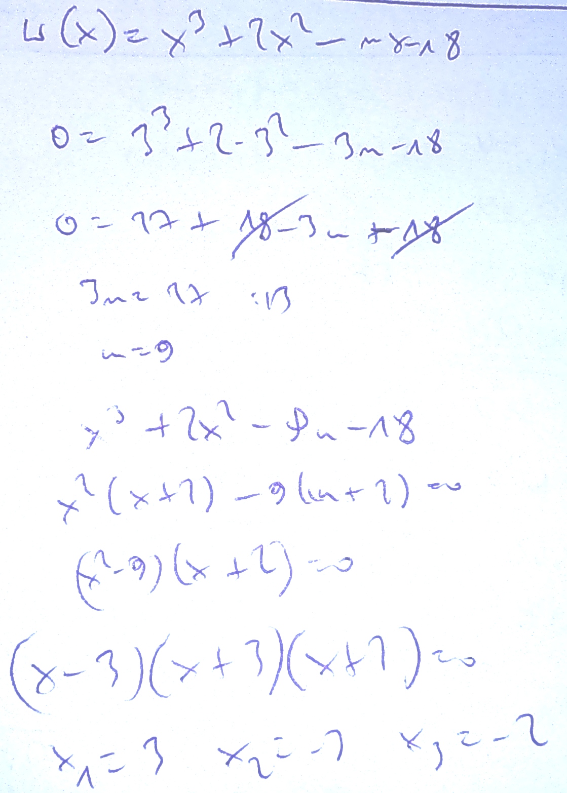 Jednym z pierwiastków wielomianu W(x)=x^3+2x^2-mx-18 jest liczba 3. wyznacz paramert m oraz pozostałe pierwiastki tego wielomianu