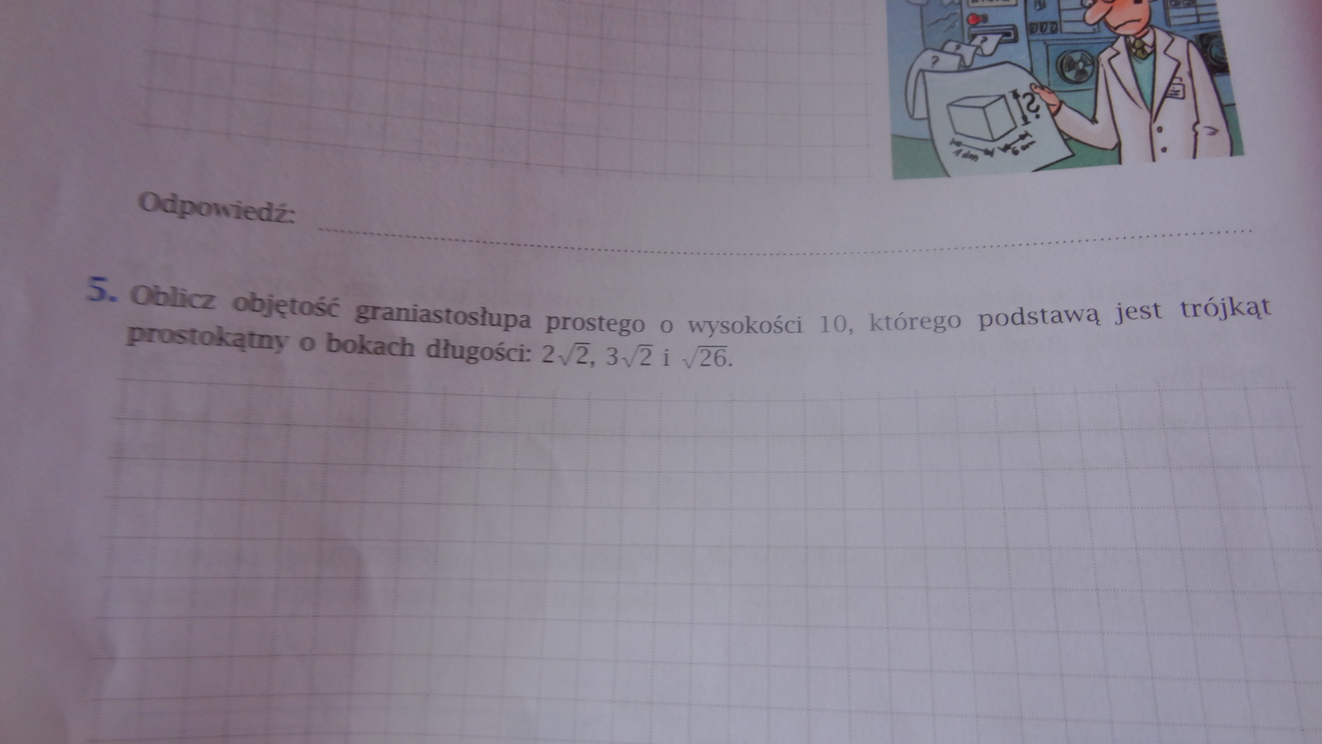 Oblicz objętość graniastosłupa prostego o wysokości 10,którego podstawą jest trójkąt prostokątny o bokach długości: 2 pierwiastki z 2,3 pierwiastki z 2 i pierwiastek z 26