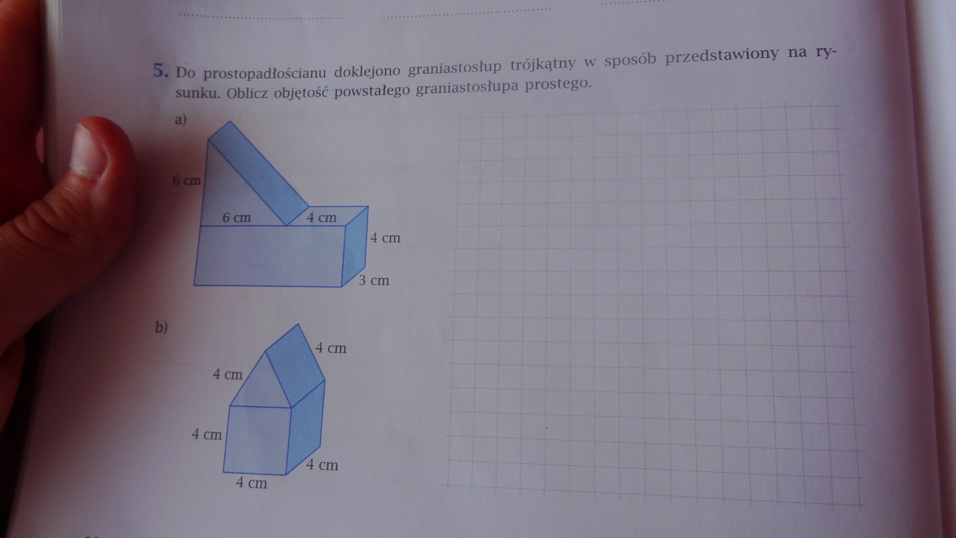 Do prostopadłościanu doklejono graniastosłup trójkątny w sposób przedstawiony na rysunku. Oblicz objętość powstałego graniastosłupa prostego.