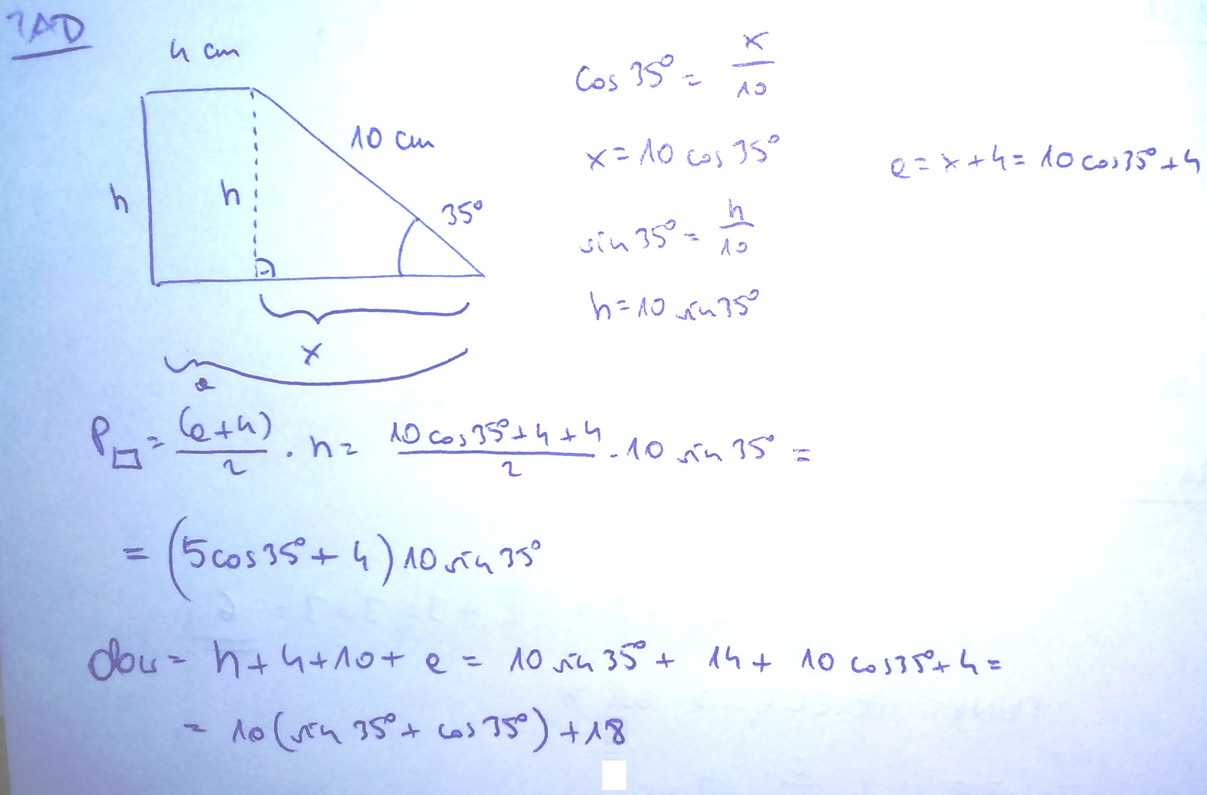 W trapezie prostokątnym ramię o długości 10 cm jest nachylone do dłuższej podstawy pod kątem 35 stopni. Krótsza podstawa wynosi 4 cm. Oblicz pole i obwód tego trapezu.