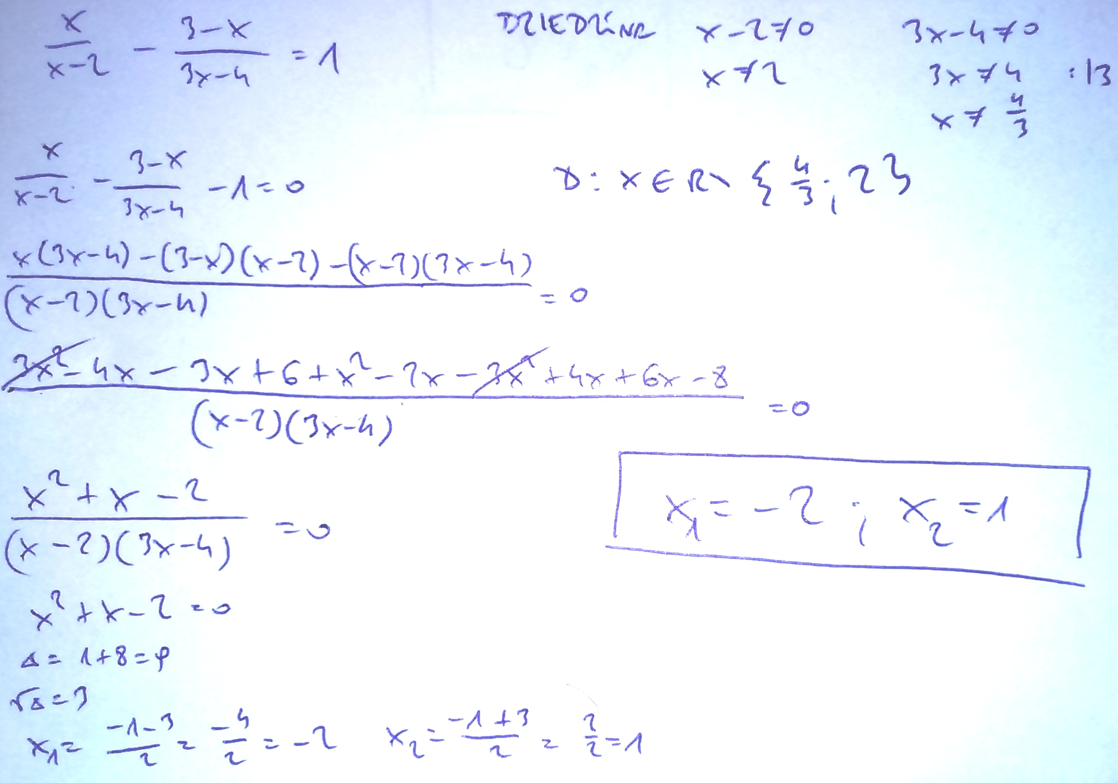 \frac{x}{x-2} - \frac{3-x}{3x-4} = 1