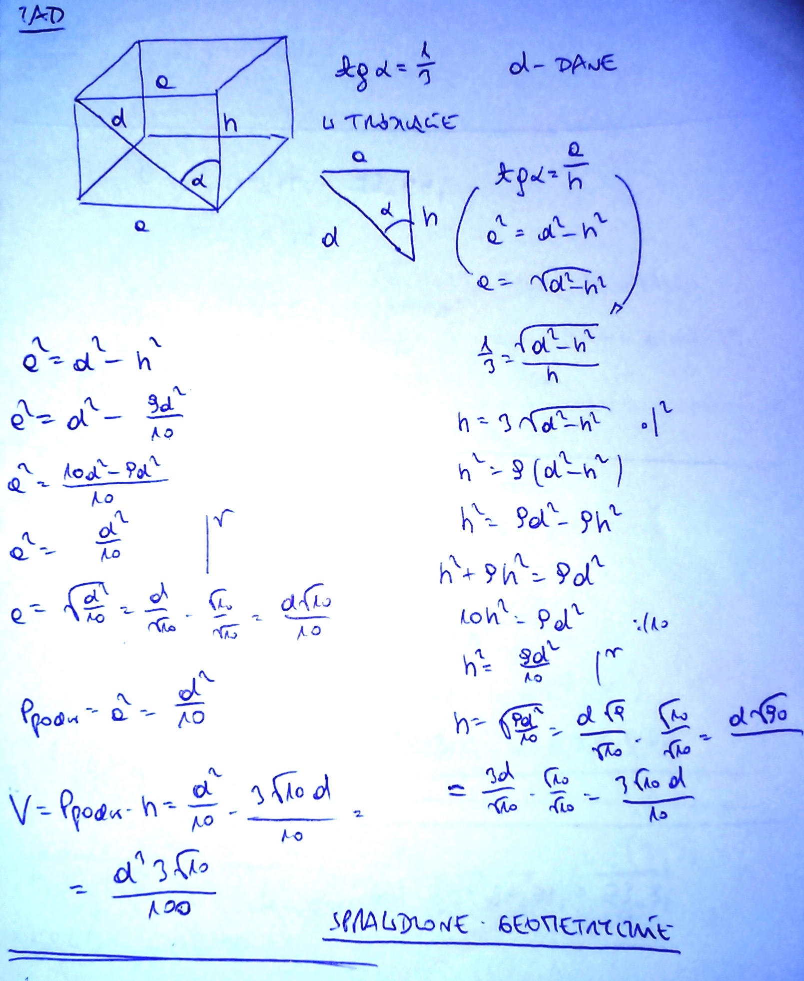 oblicz objętosć graniastosłupa prawidłowego czworokatnego , jesli przekatna ściany bocznej tego graniastosłupa tworzy z jego krawędzia boczna taki kat alfa , ze tangens alfa = 1/3