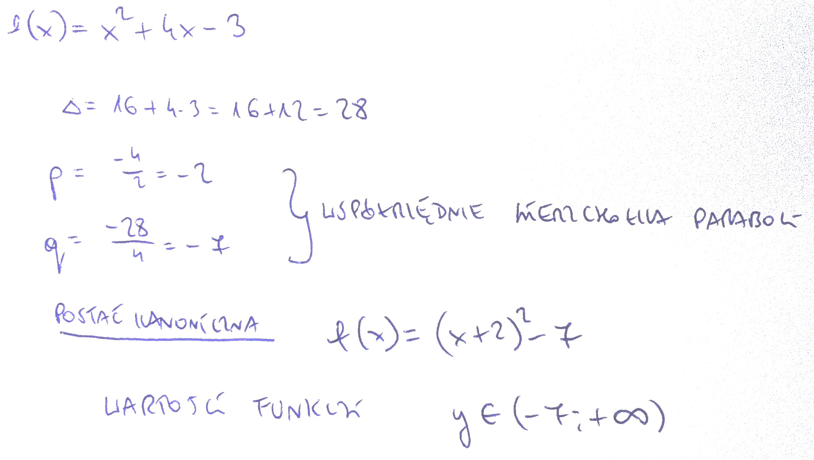 Dana ist funkcji f(x)=x^2 +4 x-3 . b) oblicz p i q . c) zapisz wzór w postaci kanonicznej . d) narysuj wykres podaj wartości