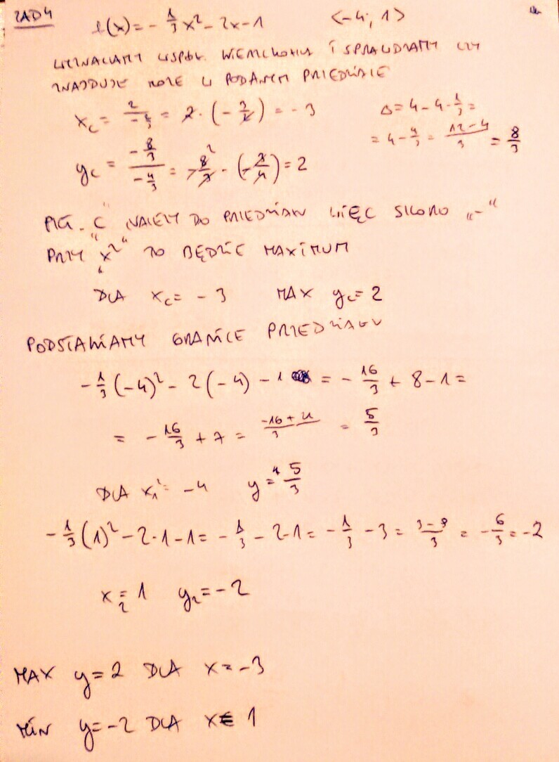 4. Znajdź największą i najmniejszą wartość funkcji f(x)= -1/3x^2-2x-1 w przedziale <-4;1>