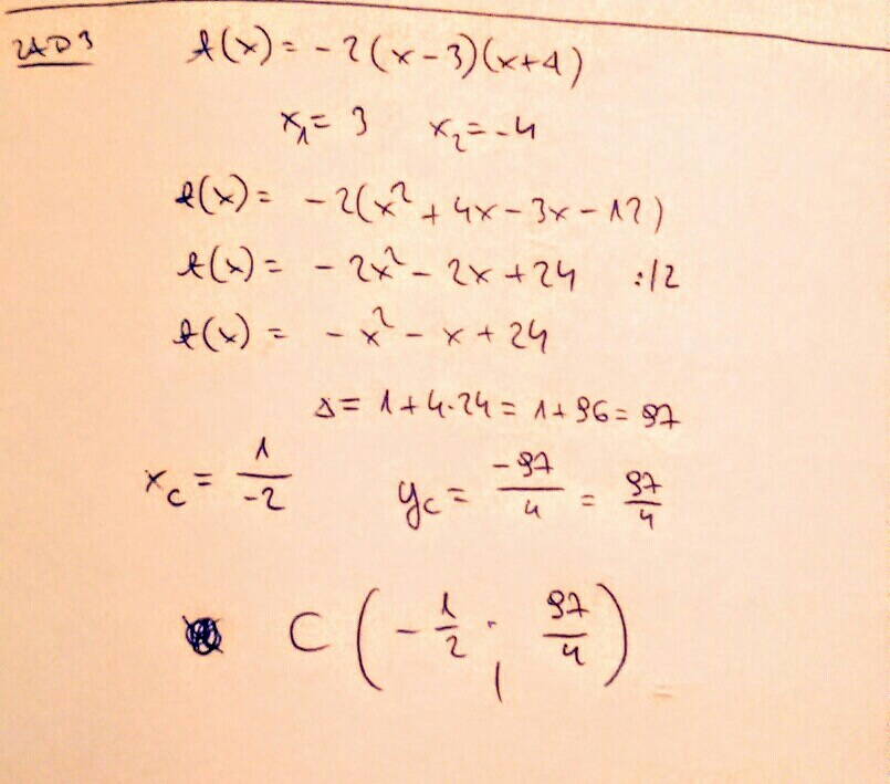3. Dana jest funkcja f(x)= -2(x-3)(x+4). Wyznacz jej miejsca zerowe oraz współrzędne wierzchołka paraboli.