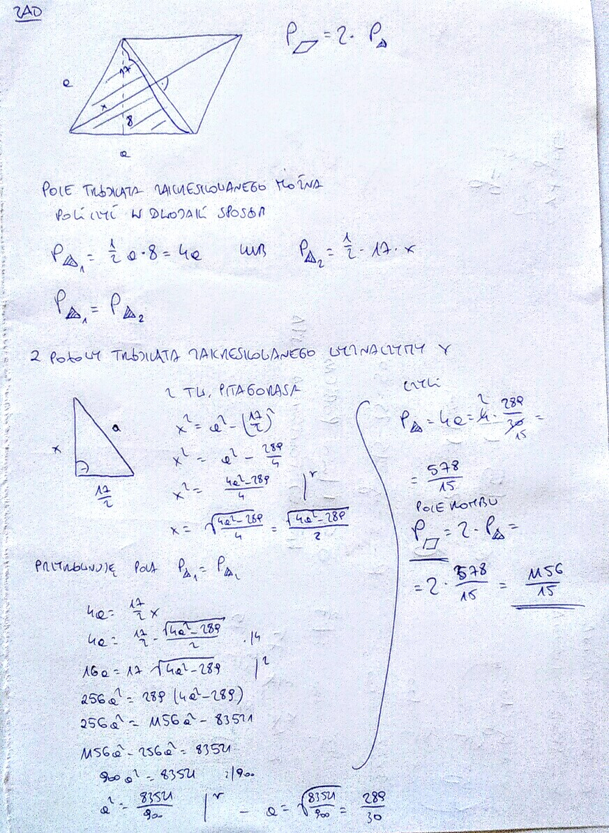 Oblicz pole rombu w którym krótsza przekątna ma długość 17cm, a wysokość 8cm.