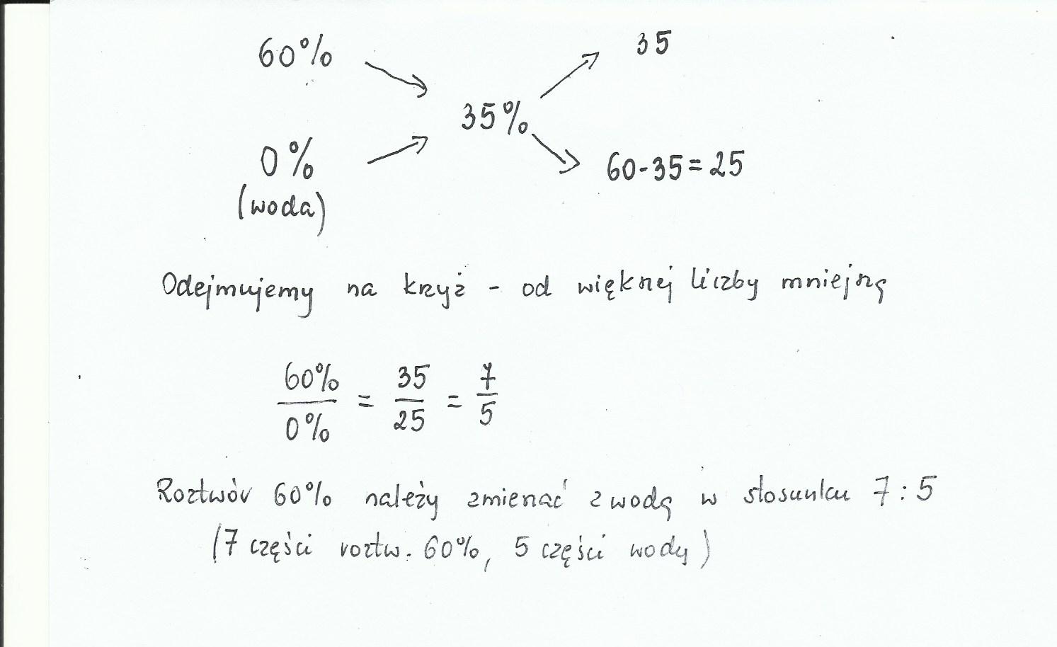 W jakim stosunku należy zmieszać roztwór 60% z wodą by otrzymać 35 %