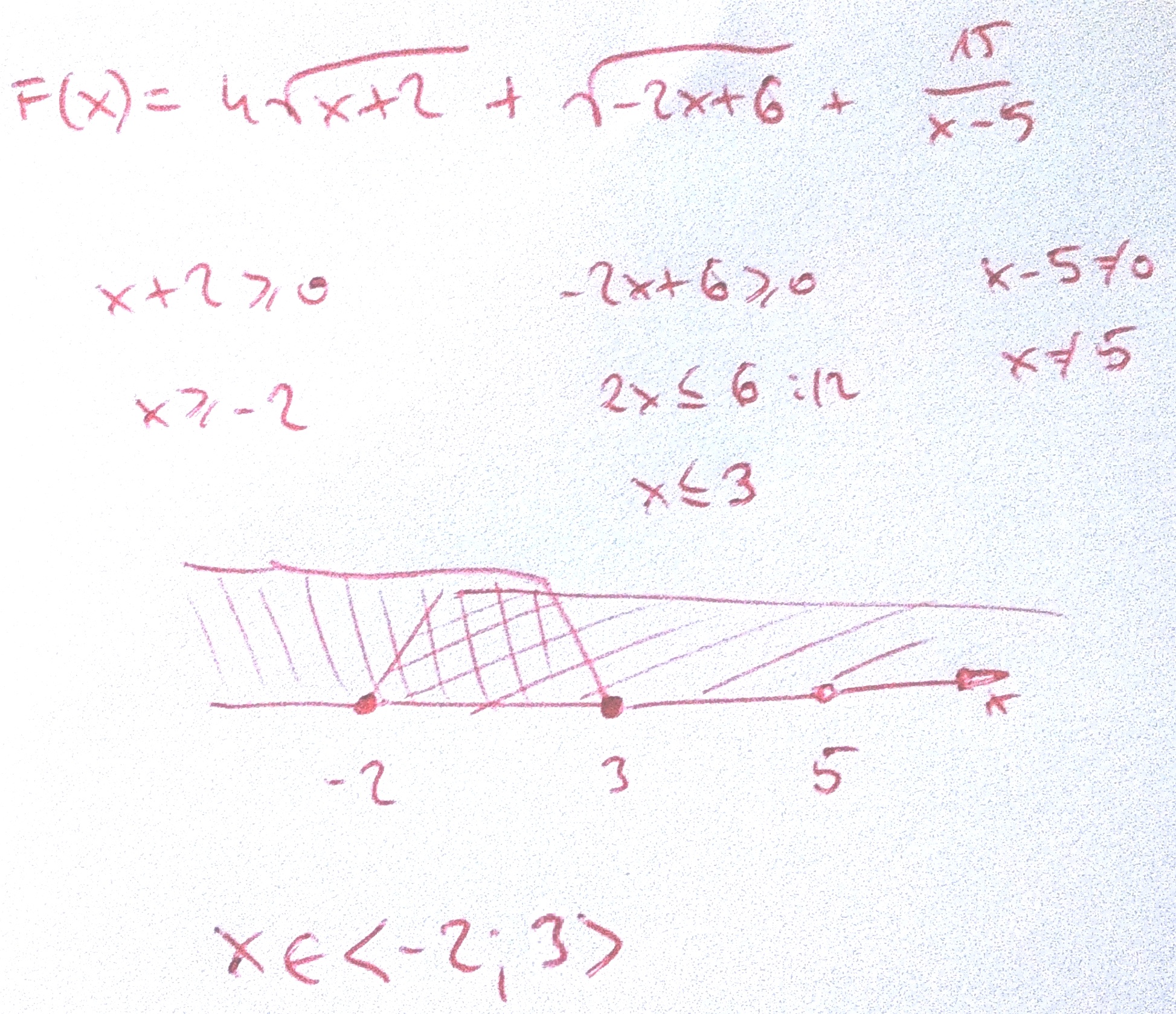 F(x) = 4√x+2 + √-2x+6 + 15/x-5