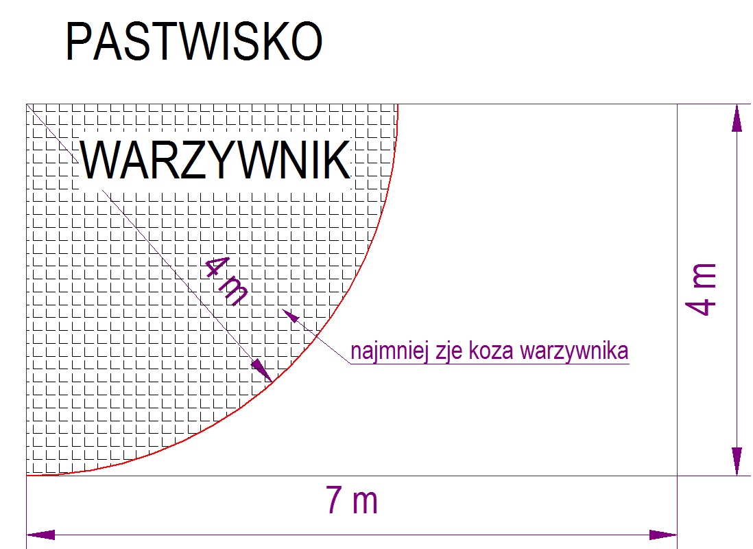 Antek i Bogdan mieli uwiązać kozę na zewnątrz płotu odgradzającego warzywnik od pastwiska warzywnik ma wymiary 4m x 7m a sznurek ma długość 4m. Antek chce przywiązać kozę w punkcie A, a Bogdan w punkcie B Która propozycja jest lepsza dla kozy?