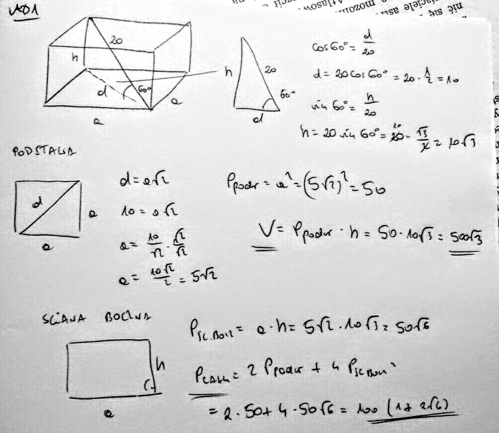 1. W graniastosłupie prawidłowym czworokątnym przekątna graniastosłupa o długości 20 cm tworzy z podstawą kąt o mierze 60 stopni. Oblicz objętość i pole powierzchni całkowitej graniastosłupa.