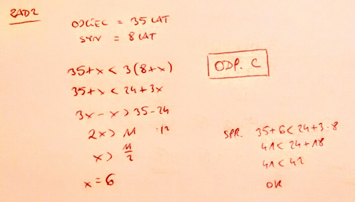 2.Ojciec ma 35 lat, a syn 8 lat. Nierówność opisująca, za ile lat ojciec będzie miał mnej niż trzy razy starszy od syna to: