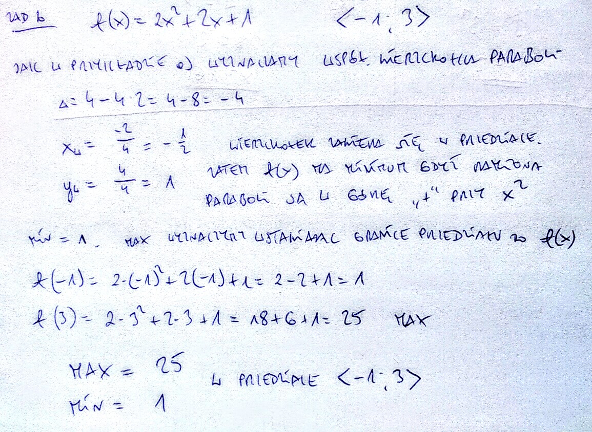 Wyznacz wartość najmniejszą i wartość największą funkcji f w podanym przedziale: a) f(x) = - x^2 + 6x +1, <-2;2>, b) f(x) = 2x^2 + 2x + 1, <-1;3>, c) f(x) = - x^2 + 4x + 1, <0;3>