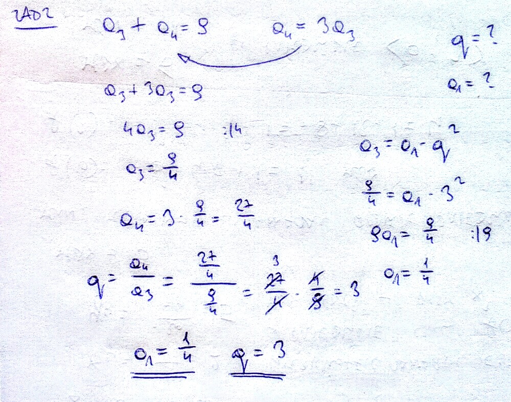 2. W pewnym ciągu geometrycznym suma trzeciego, czwartego jest równa 9, a czwarty wyraz jest o 3 większy od trzeciego. Wyznacz iloraz oraz pierwszy wyraz tego ciągu.