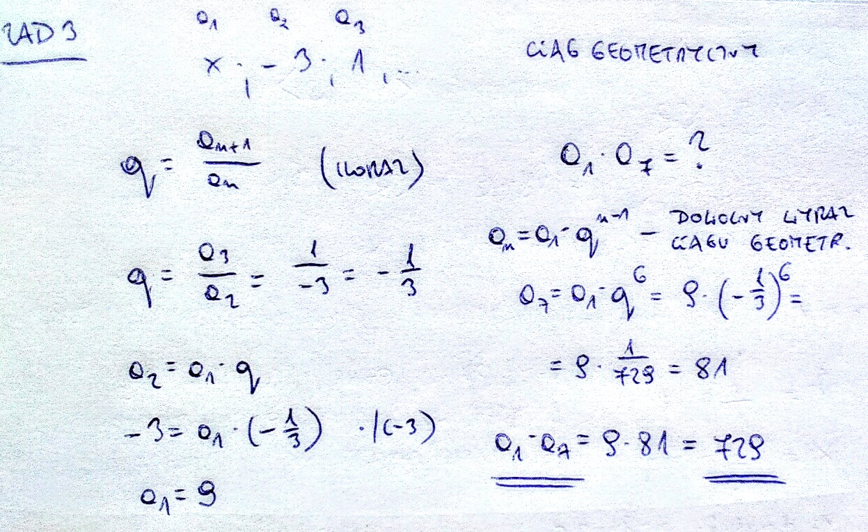 3. Ciąg (x, -3, 1,...) jest geometrycznym. Oblicz iloczyn pierwszego i siódmego wyrazu tego ciągu.
