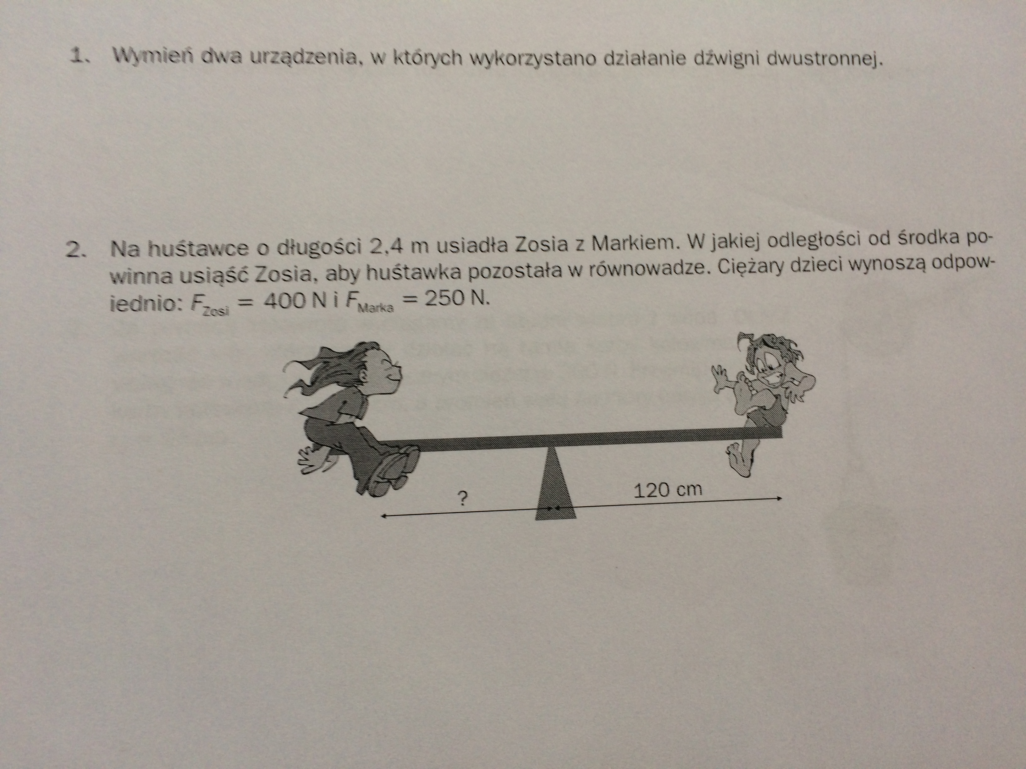 Iloczyn siły i odległości od środka huśtawki jest jednakowy dla Zosi i Marka.