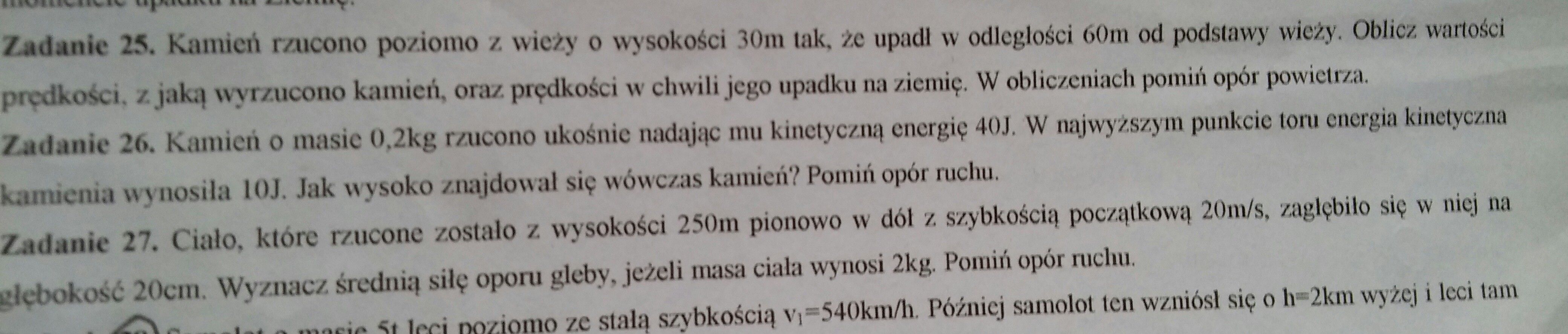 Prędkość końcową liczymy z zasady zachowania energii: Energia kinetyczna kamieniu w chwili wyrzucania plus energia potencjalna na wysokości h jest równa końcowej energii kinetycznej: