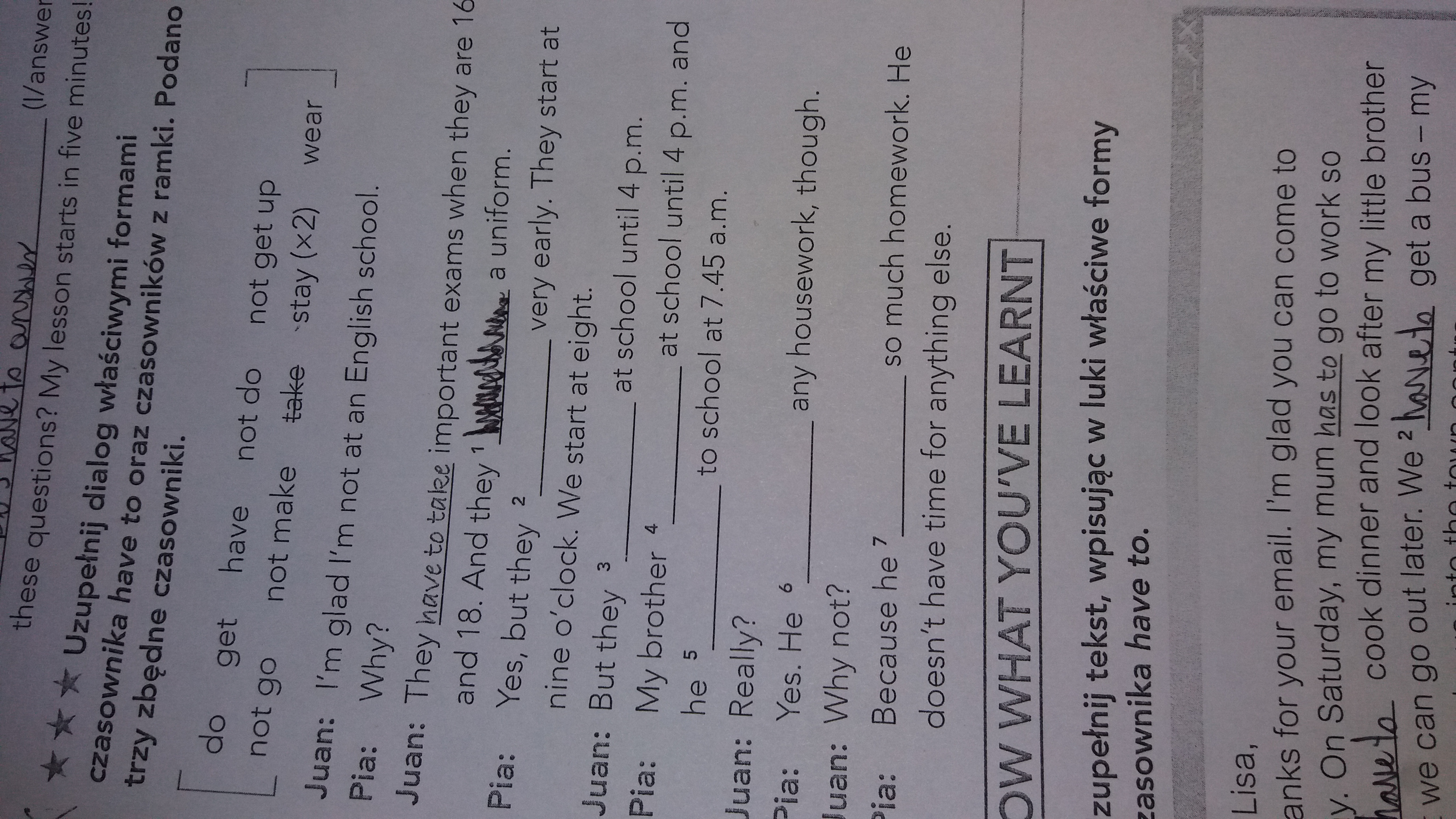 Uzupełnij dialog właściwymi formami czasownika have to oraz czasowników z ramki. Podano trzy zbędne czasowniki.