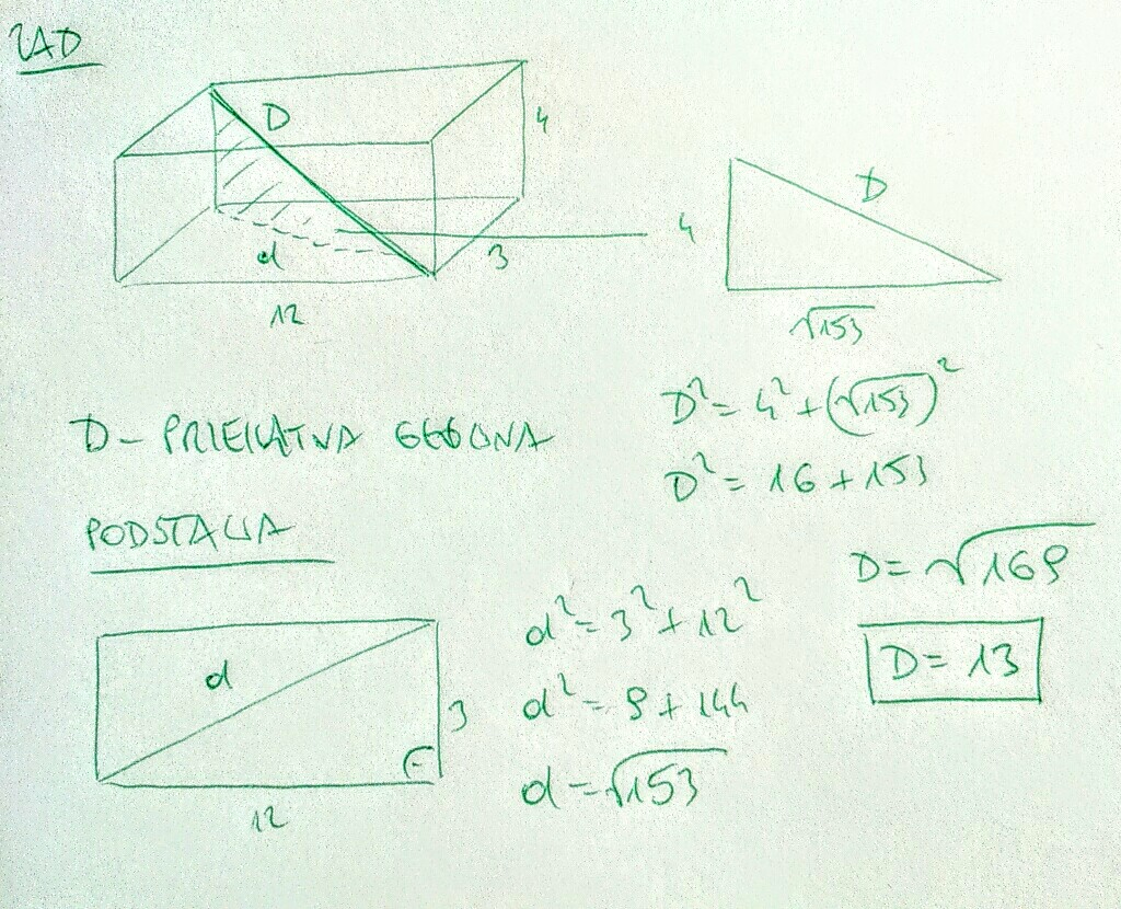 Prostopadłościan ma wymiary 3 x 12 x 4 . Jaką długość ma jego przekątna ?