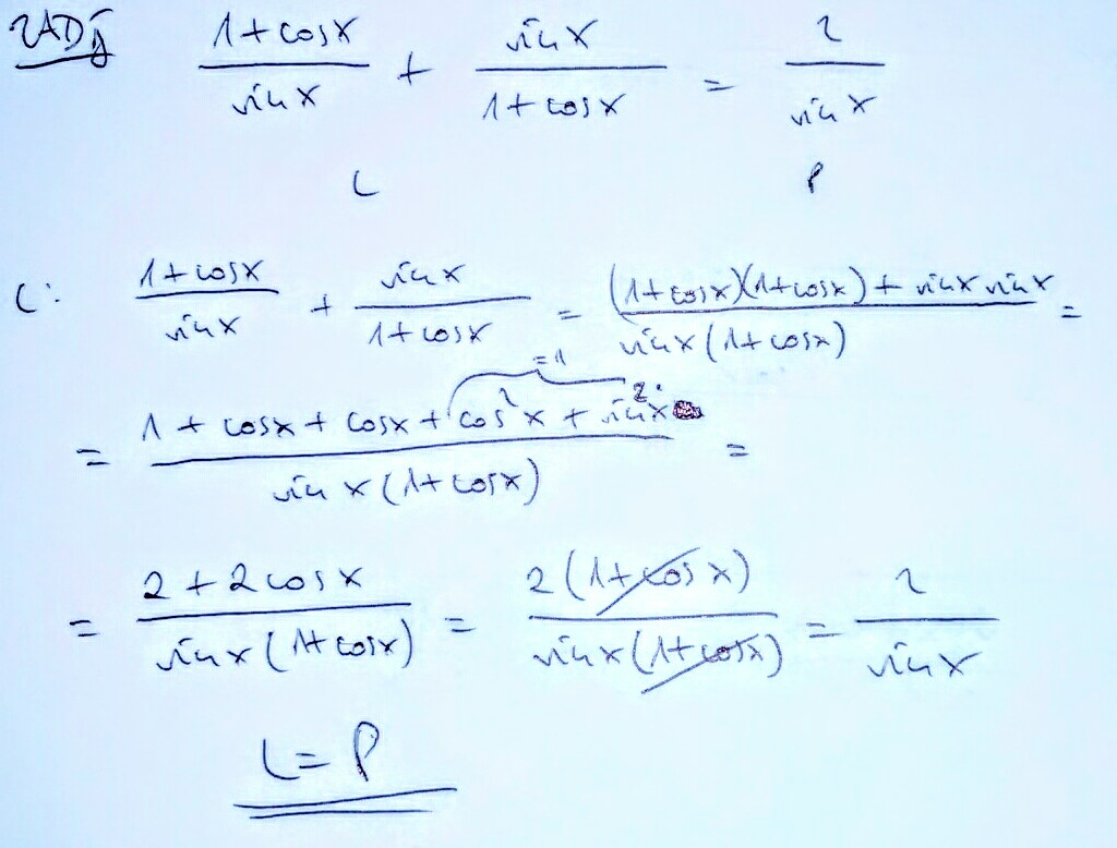 j) 1 + cosx / sinx + sinx / 1 + cosx = 2 / sinx