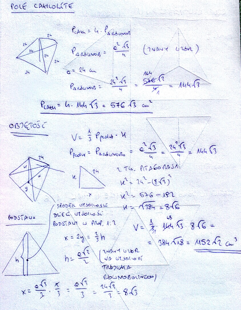 Czworościan foremny ma krawędź równą 24cm. Narysuj rzut, siatkę, oblicz pole całkowite i objętość.