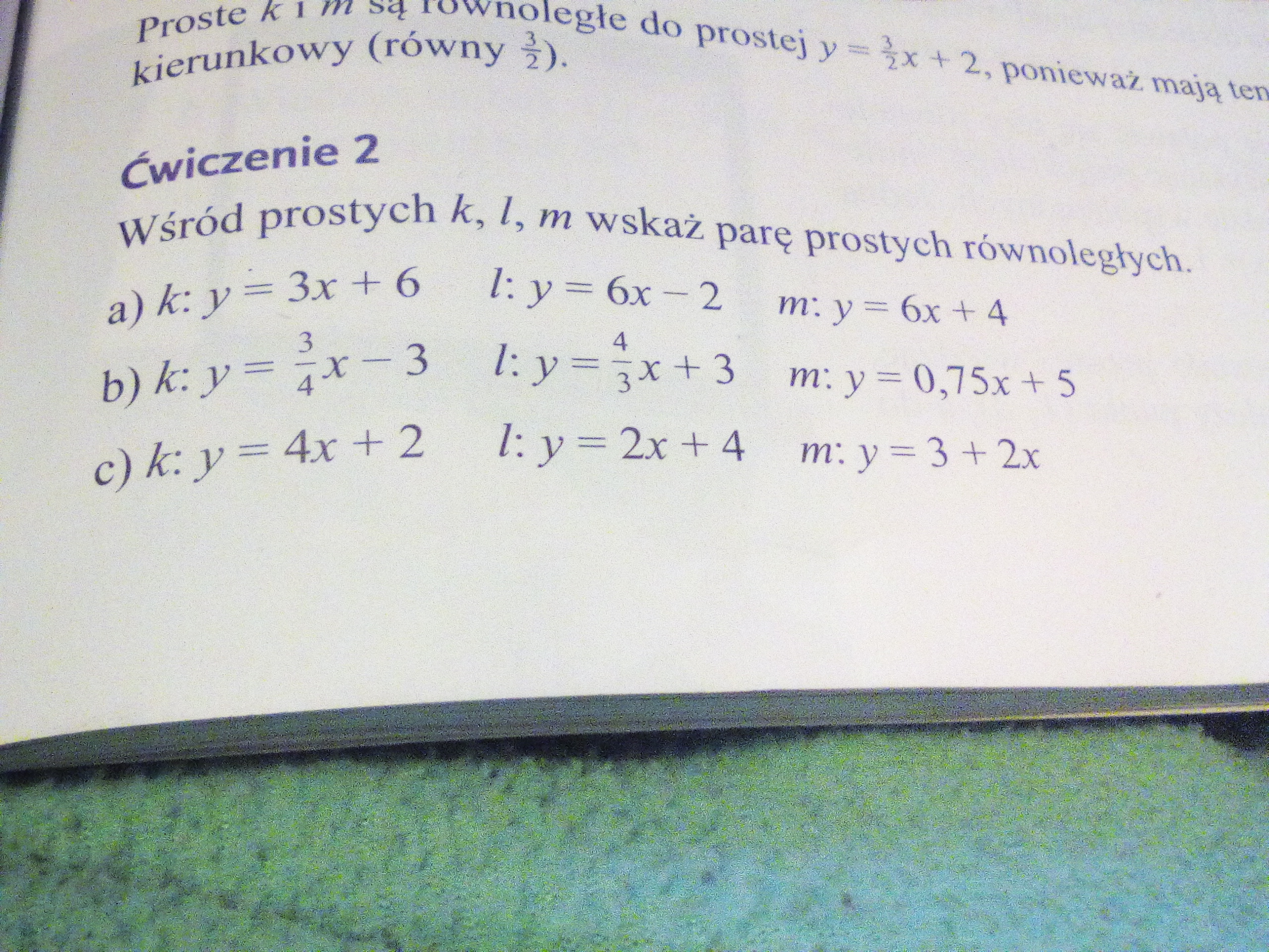 a) Proste l i m są równoległe,bo mają ten sam współczynnik kierunkowy równy 6 b) Proste k i m....współczynnik kierunkowy 3/4 ; 0,75 = 3/4 c) Proste l i m.....współczynnik kierunkowy 2.