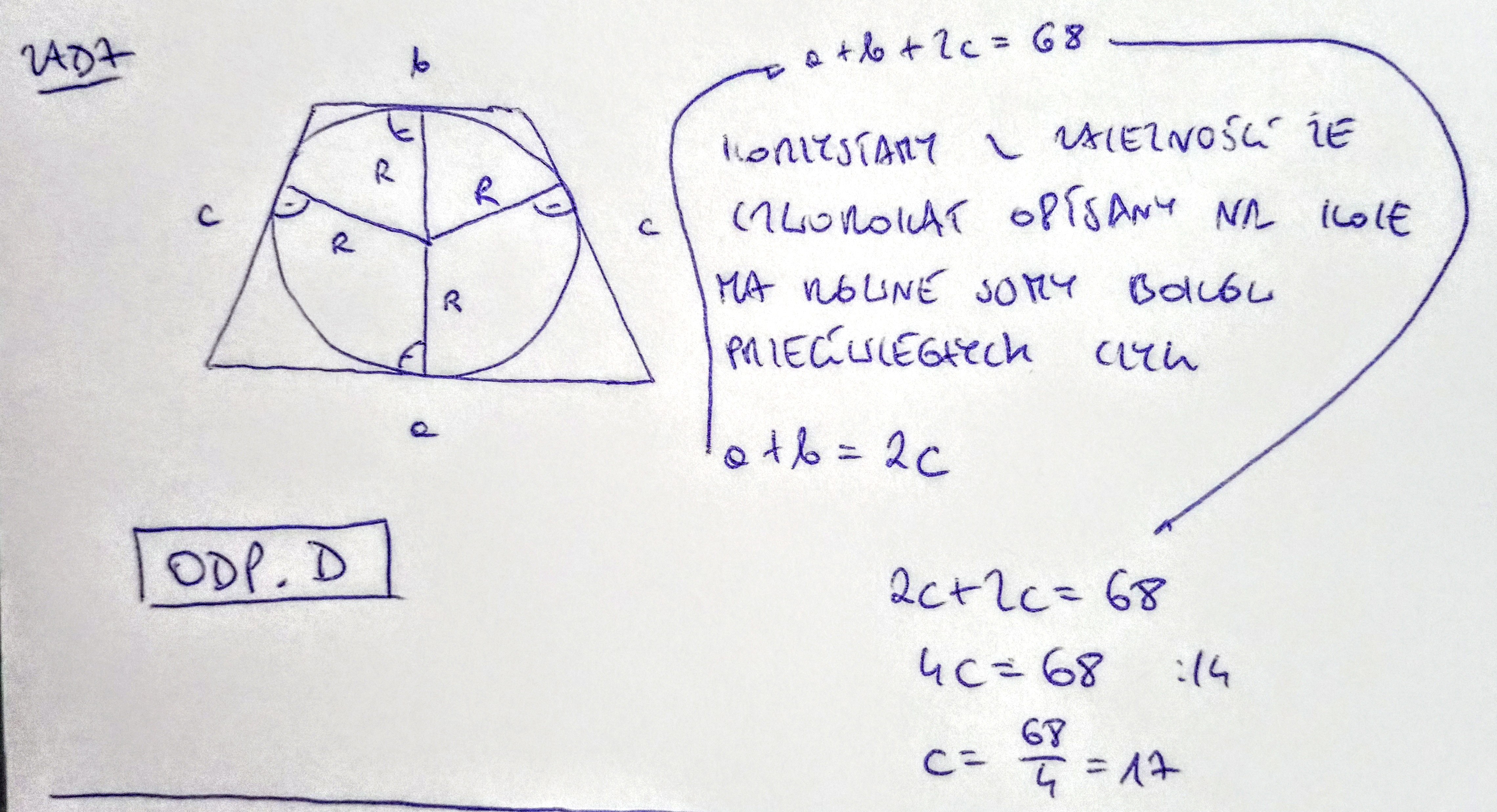 Jest takie twierdzenie: Jeśli czworokąt jest opisany na okręgu to sumy długości jego PRZECIWLEGŁYCH bokąw są równe.