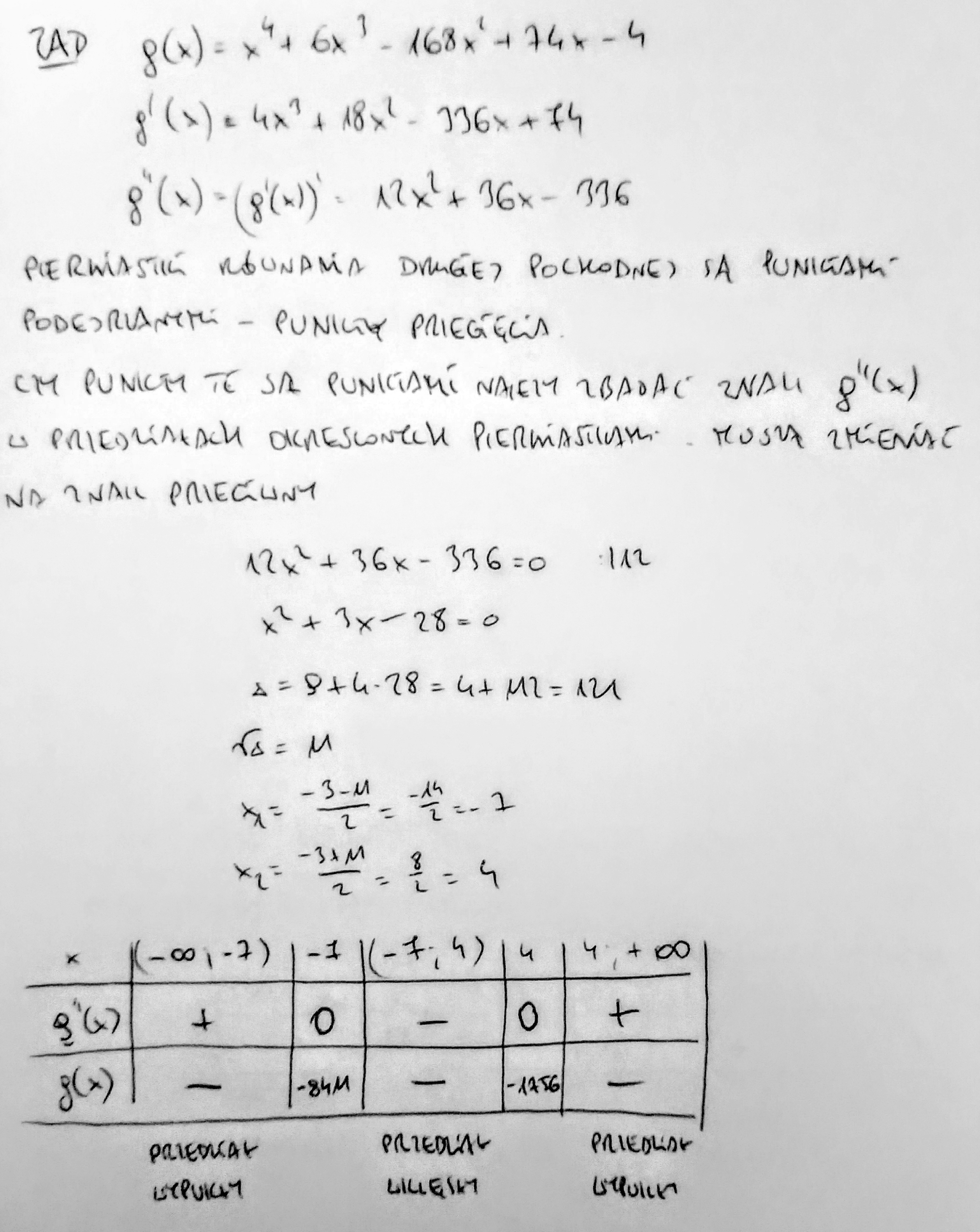Zauważ, że ponieważ g '' (x) jest funkcją kwadratową, to przy "przechodzeniu" przez jej miejsca zerowe MUSI ona zmienić znak, więc te punkty przegięcia są poprawnie określone.