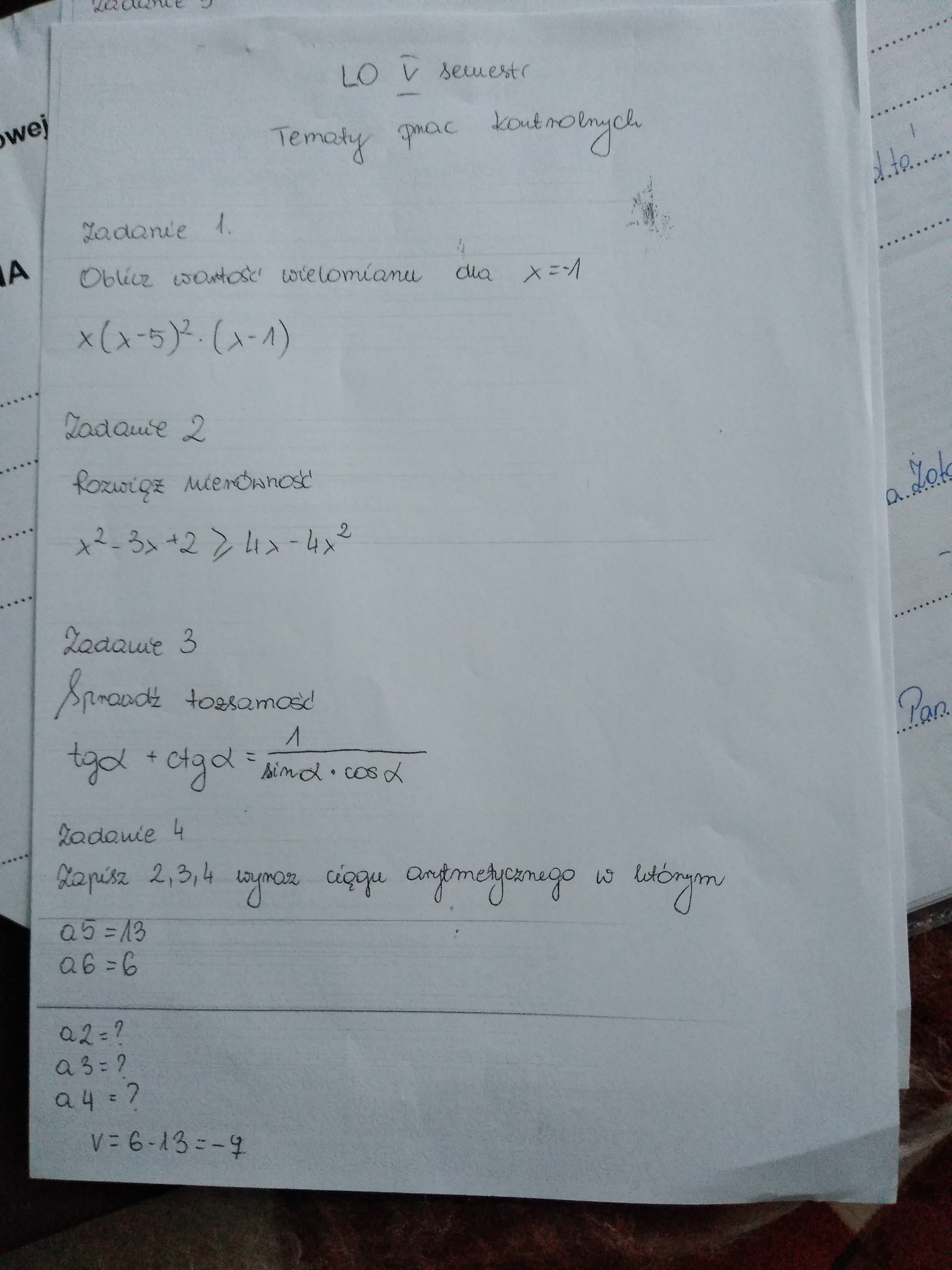 Czwarty wyraz: a4 = a5 - r = 6 - 7 = - 1