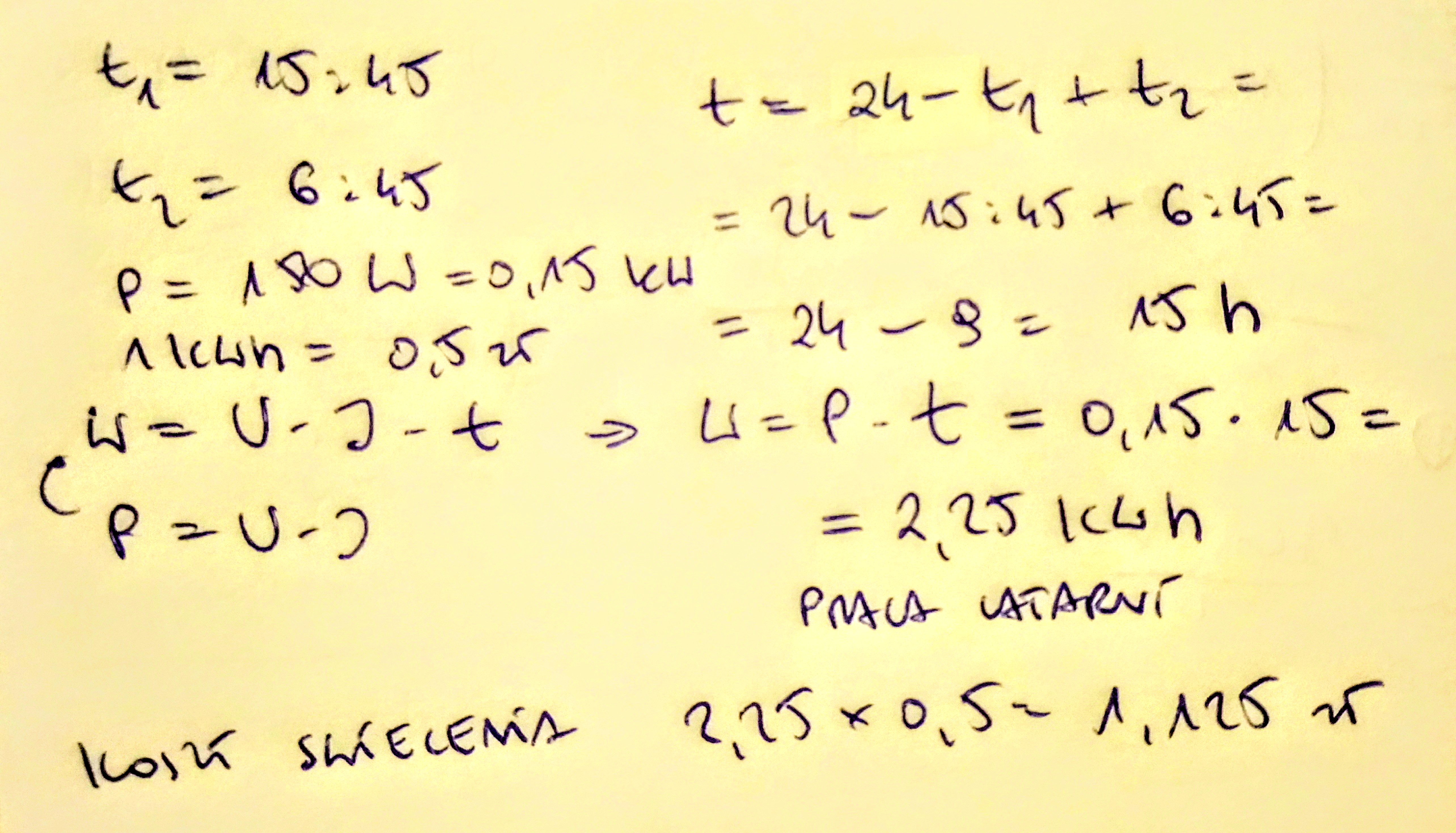 Oblicz koszt świecenia jednej latarni ulicznej nocą z 14-15 listopada wiedząc ,że działa ona od zachodu do wschodu słońca.Zachód słońca jest o godz.15:45, a wschód 6:45. Moc latarni wynosi 150 W,a koszt 1 KWH wynoisi 0,50 zł .Jaką pracę wykonał prąd w tym czasie?