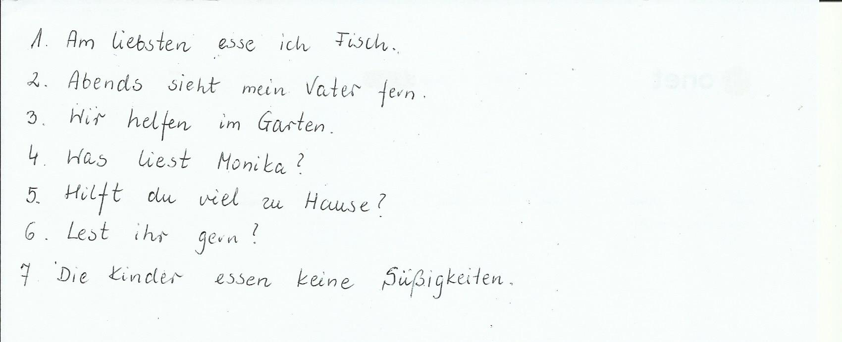 1. am liebsten ……… ich fisch. (essen) 2. abends ……………… mein vater ………… . (fernsehen) 3. wir ………………… im garten. (helfen) 4. was …………… monika? (lesen) 5. …………… du viel zu hause? (helfen) 6. ……………. ihr gern? (lesen) 7. die kinder …………….. keine süßigkeiten. (essen)