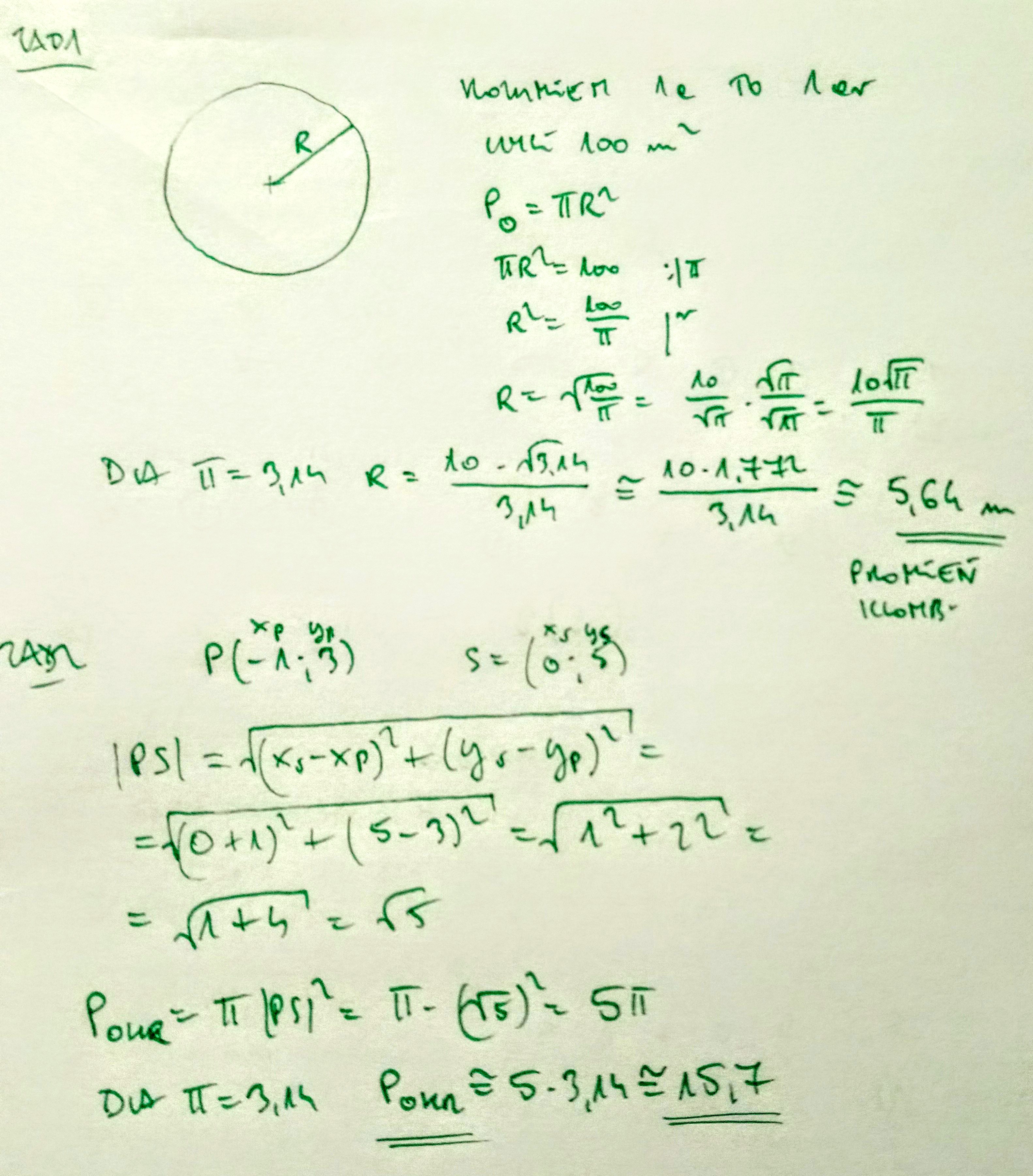 Zad 2. Punkt P(-1,3) leży na okręgu o środku S=(0, 5).Oblicz pole koła ograniczonego tym okręgiem