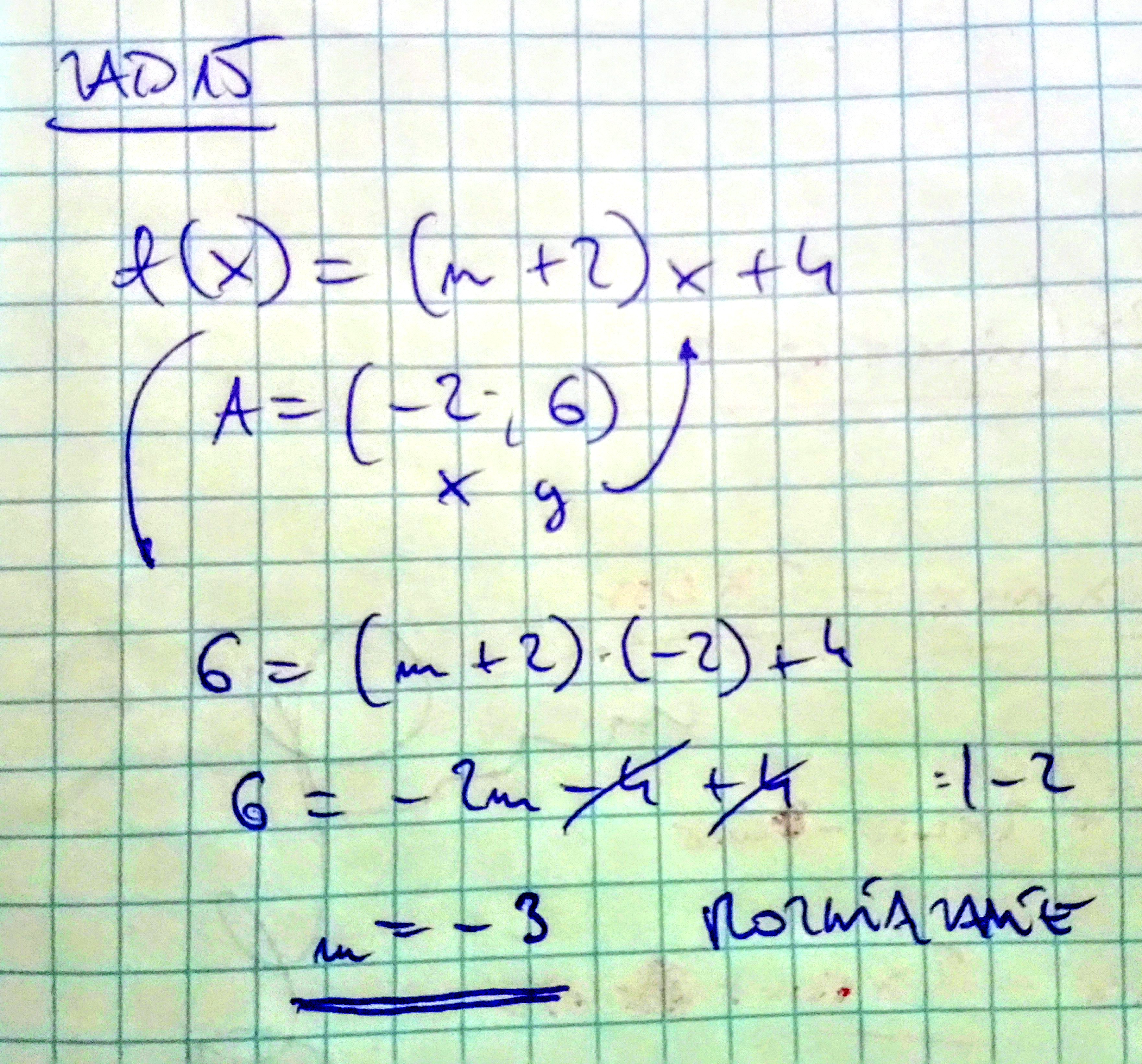15. Na wykresie funkcji liniowej określonej wzorem f(x) = (m+2)x +4 leży punkt A = (-2,6) . Zatem