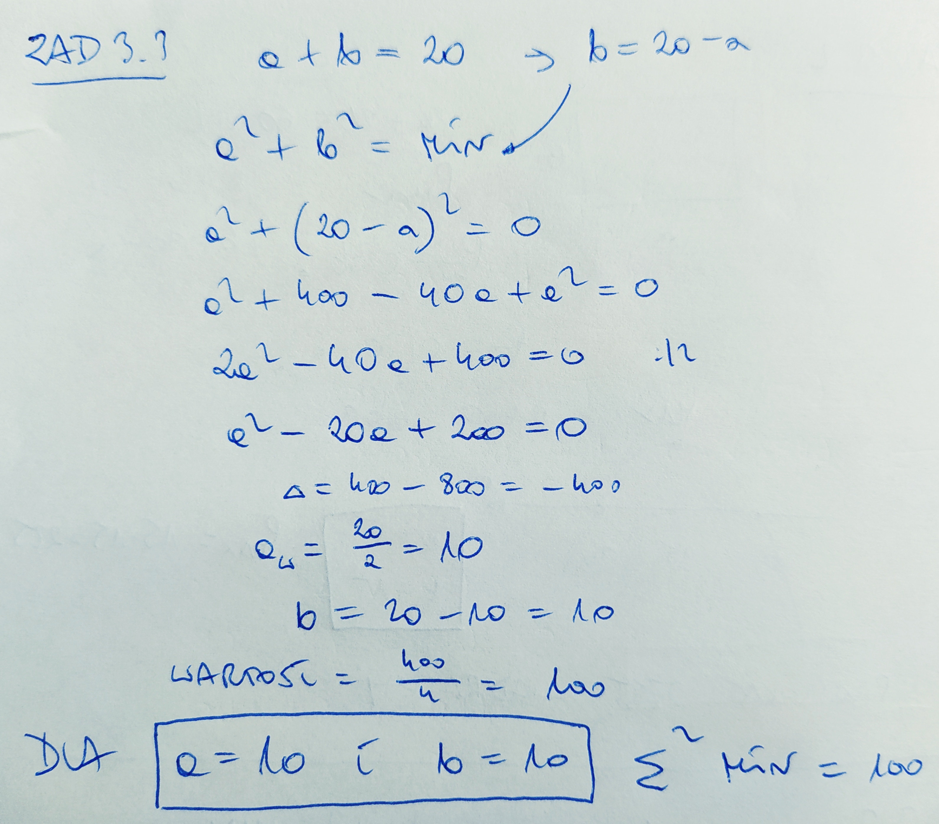 3.3. Liczbę 20 przedstaw w postaci sumy dwóch składników, tak aby suma ich kwadratów była najmniejsza.