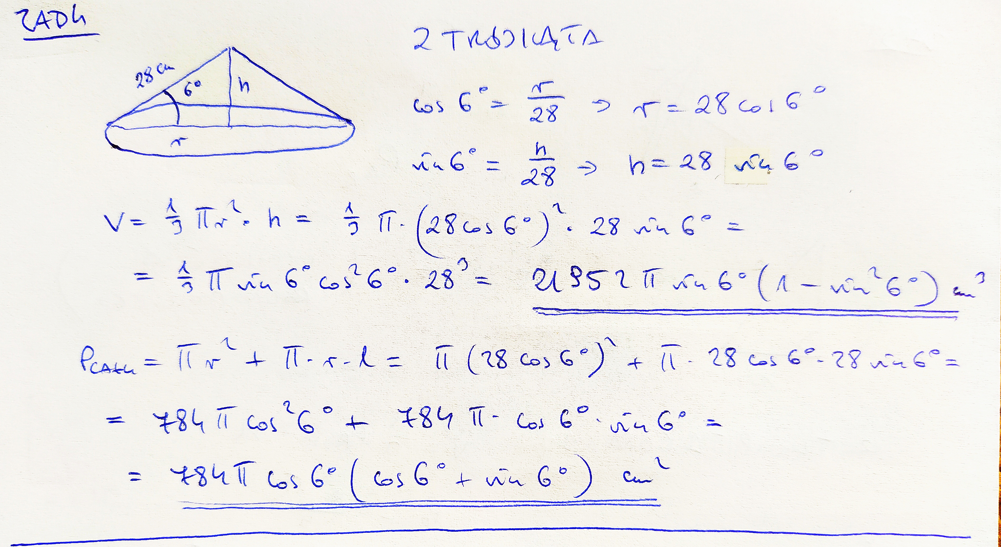 Tworząca stożka ma długość 28 cm i jest nachylona do płaszczyzny podstawy pod kątem 6stopni. Oblicz pole całkowite i objętość objętość stożka.