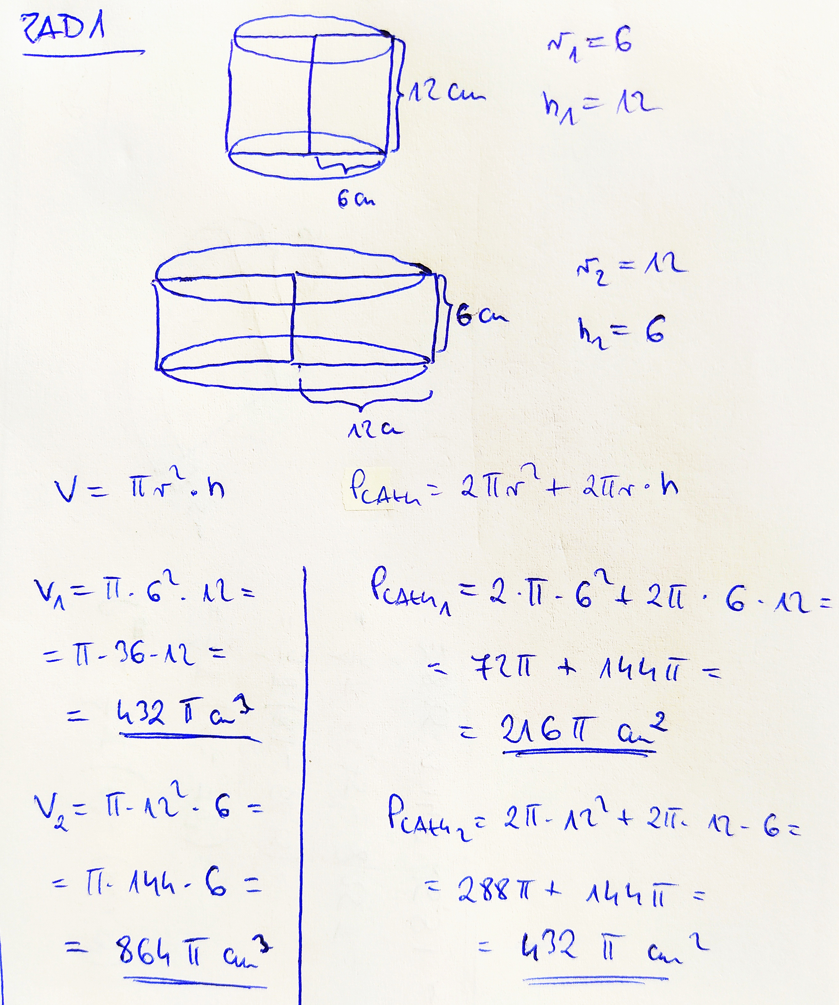Prostokąt o bokach 6cm i 12cm obrócono wokół: a) dłuższego boku, b) krótszego boku. Oblicz pole całkowite i objętość otrzymanej bryły.