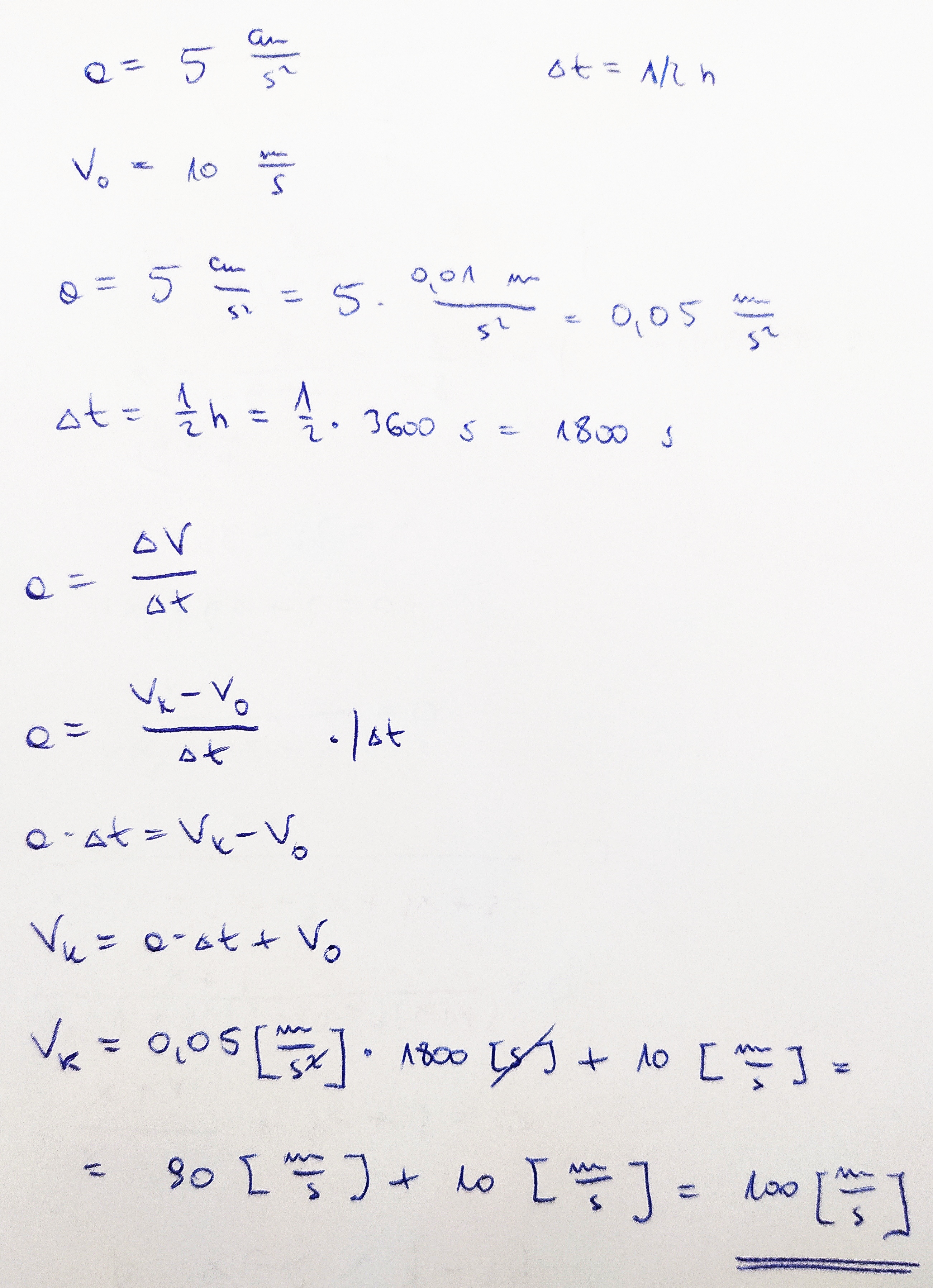 Przypuśćmy, że chcemy znaleźć prędkość punktu materialnego poruszającego się ze stałym przyspieszeniem 5,00cm/s^2, po upływie 1/2h od początku ruchu, jeżeli jego prędkość początkowa wynosiła 10,0 m/s. Decydujemy się jako jednostki długości wybrać metry, a jako jednostki czasu sekundy.