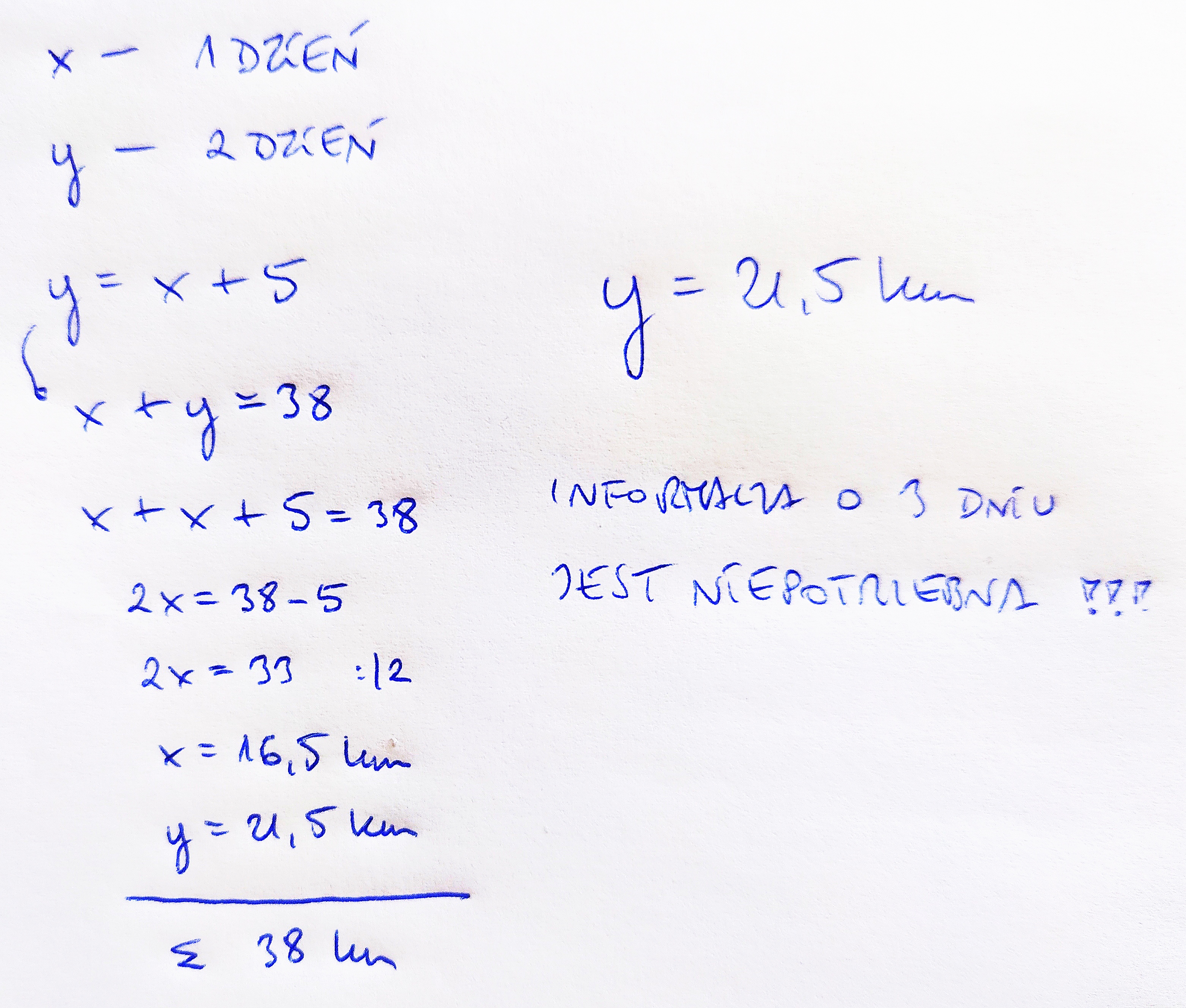 turysta w ciągu dwóch dni przeszedł 38 kilometry .drugiego dnia przeszedł o 5km wiecej niż w pierwszym dniu, a w trzecim przeszedl tyle ile razem pierwszego i drugiego dnia. oblicz ile km przeszedl drugiego dnia