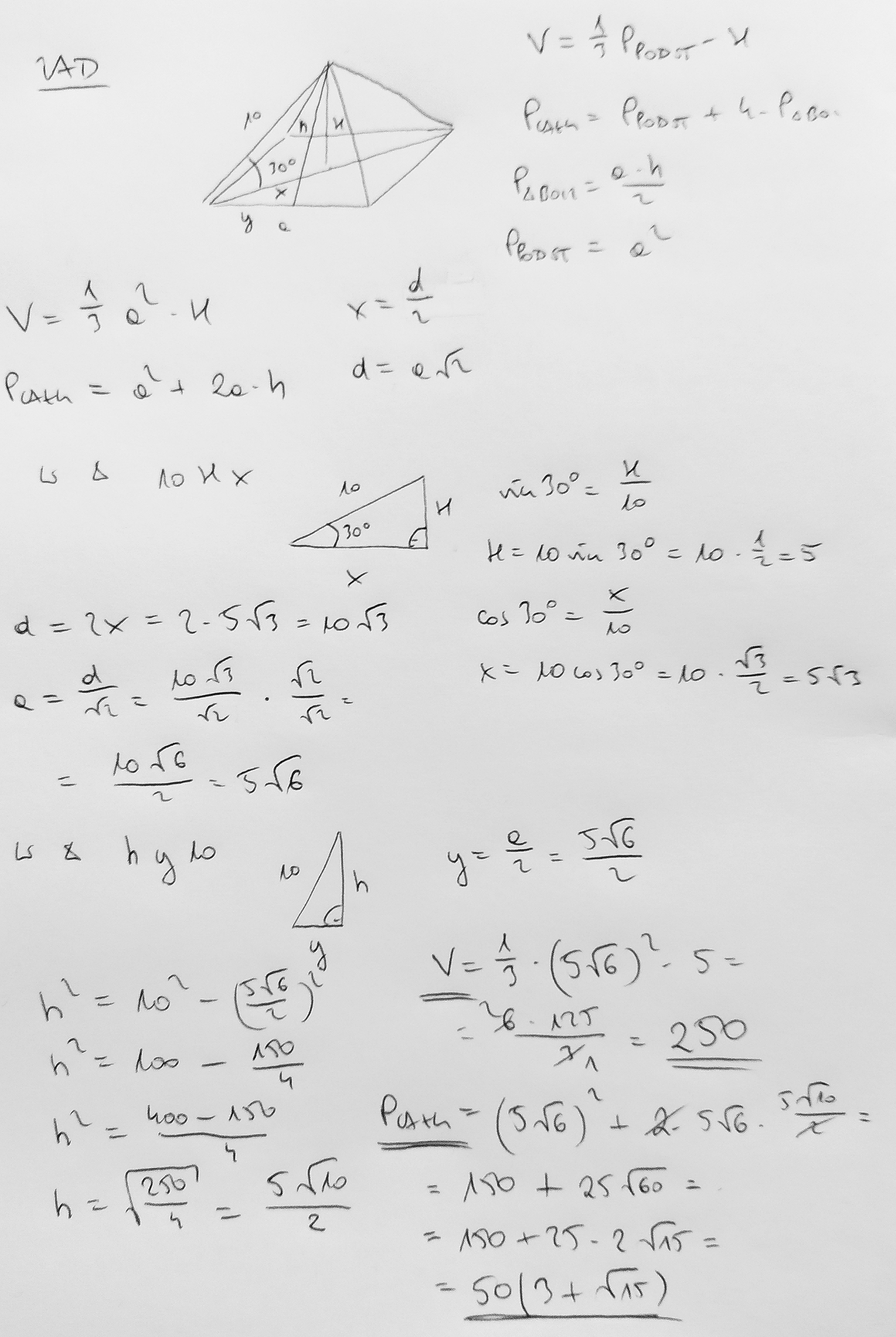 Krawędź boczna ostrosłupa prawidłowego czworokątnego ma długość 10 i jest nachylona do podstawy pod kątem 30 stopni. Oblicz objętość i pole całkowite tego ostrosłupa.