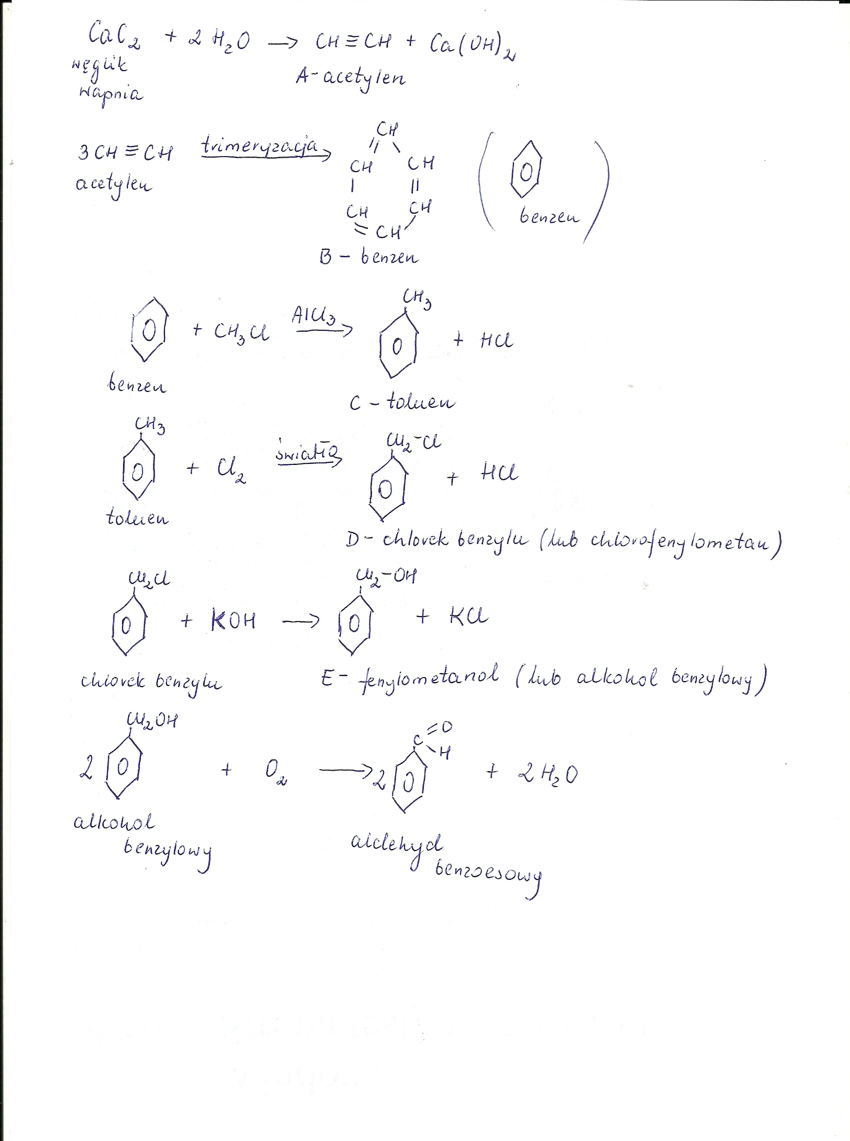 węglik wapnia (działanie wodą) --> A (trimeryzacja ) --> B ( działanie CH3Cl/AlCl3)--> C ( działanie Cl2 i światła ) --> D (działanie KOH)--> E (utlenianie) --> aldehyd benzoesowy