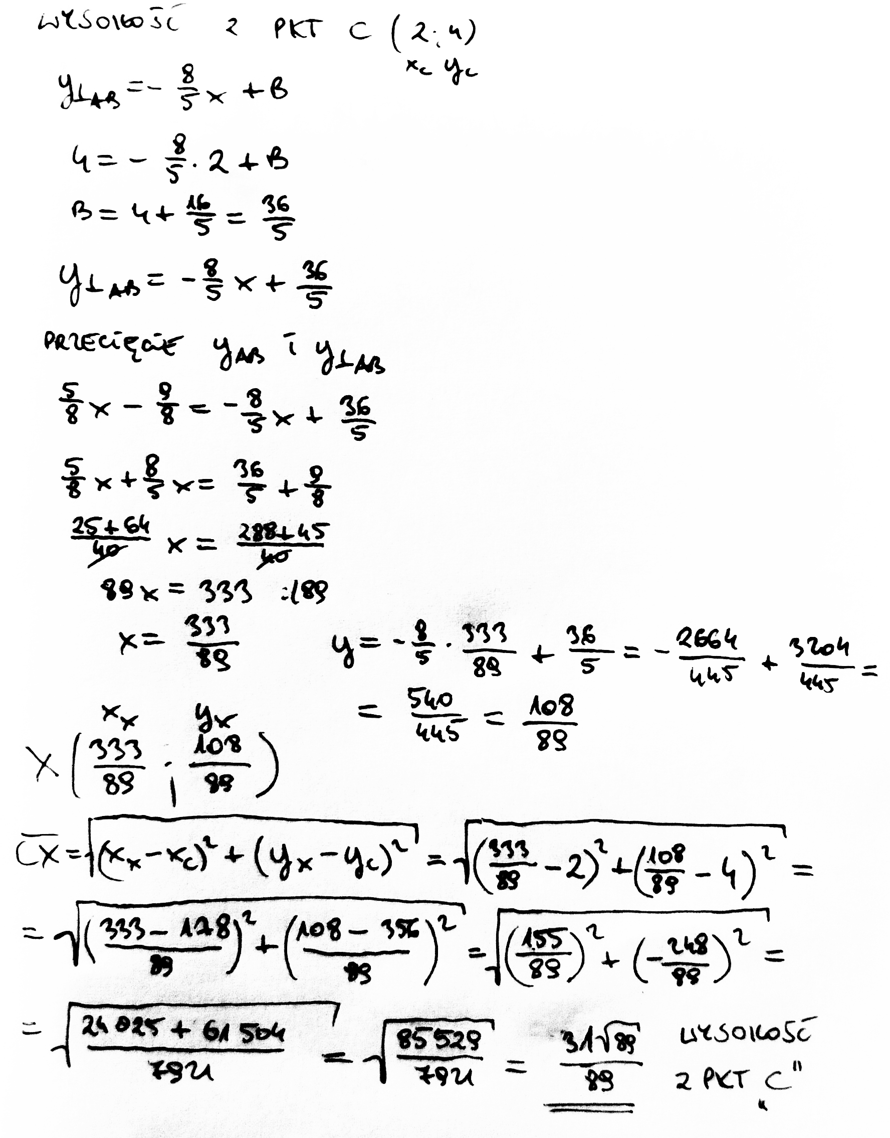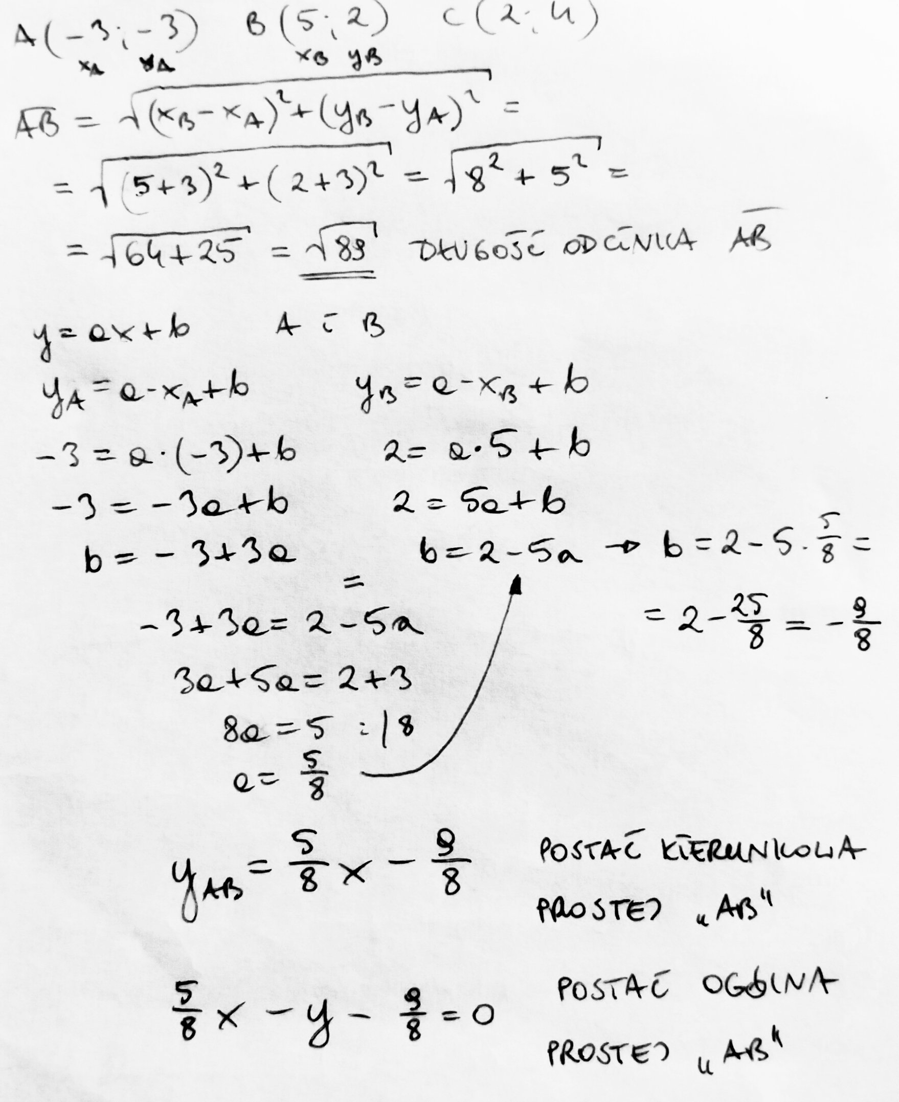 dany jest trójkąt o wierzchołkach ABC A(-3,-3) B(5,2) C(2,4) oblicz długość odcinka AB, równanie prostej AB w postaci kierunkowej i ogólnej, długość wysokości opuszczonej z wierzchołka C i pole trójkąta ABC proszę o pomoc i z góry dziękuje.